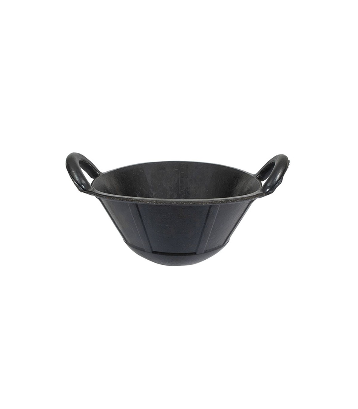 Caucho natural reforzado por fibras textiles (mayor resistencia a la abrasión). Escala graduada moldeada en el interior. Fondo exterior nervado para facilitar el agarre. Con dos asas. Color negro.
