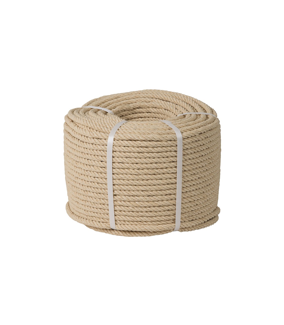 Cuerda torcida polipropileno de alta tenacidad, 4 cabos. Compuesto anti-UVA. Color beige. Aplicaciones: decoración, pasamanos, trabajos manuales, deportes, toldos, etc.