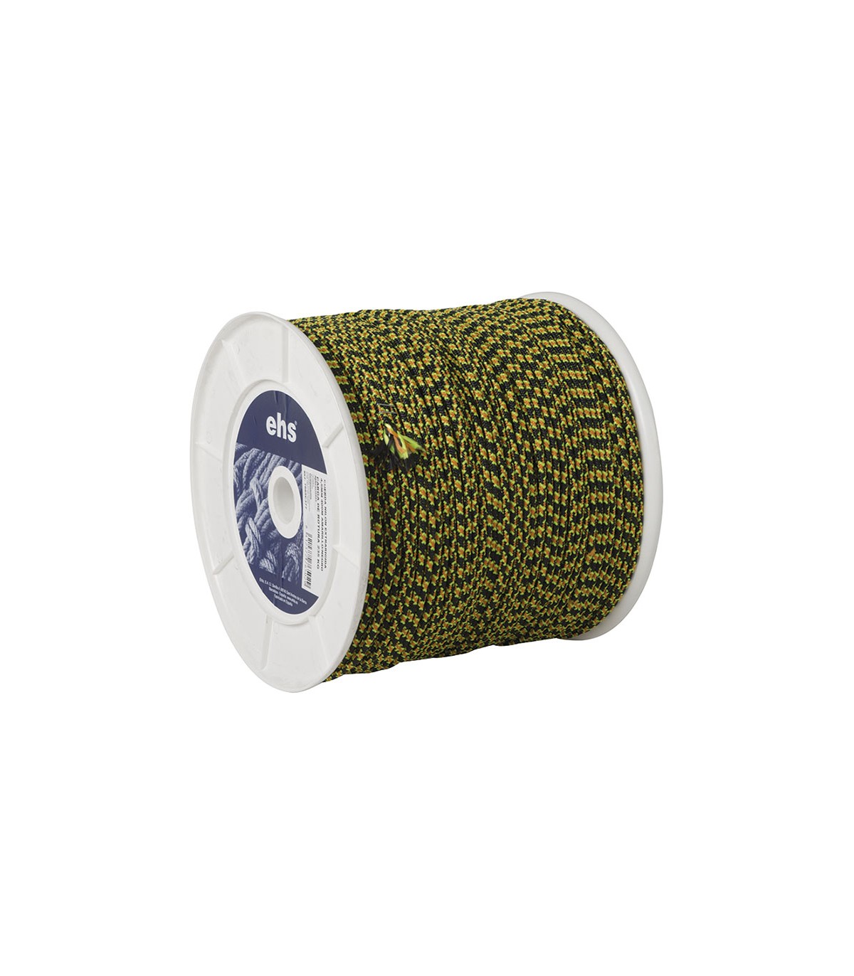 Cuerda trenzada doble capa con alma monofilamento. Compuesto anti-UVA. Aplicaciones: tendederos, decoración, etc. Bobinas.