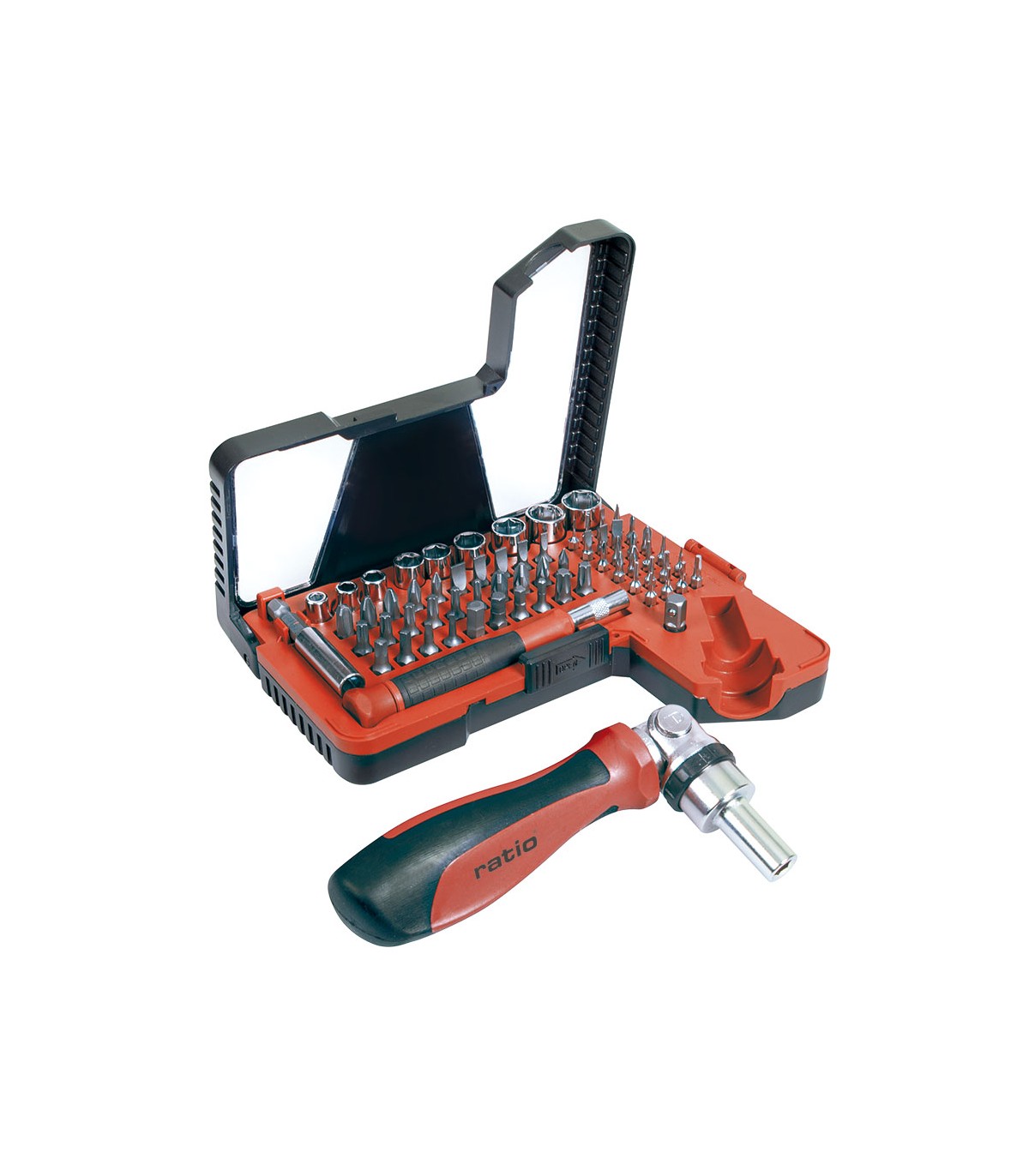 Puntas 1/4" acero cromo-vanadio S2. Puntas precisión 4 mm acero cromo-vanadio. Práctica carraca reversible y acodada ajustable con extremo magnético. Presentado en estuche.