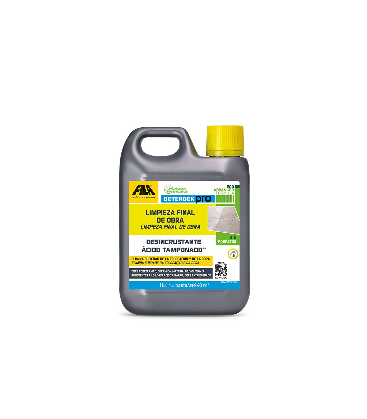 Detergente multiusos, materiales resistentes ácidos. Elimina restos obra. Según dilución, desincrusta, limpia a fondo. Rendimiento: 20/40 m² litro.