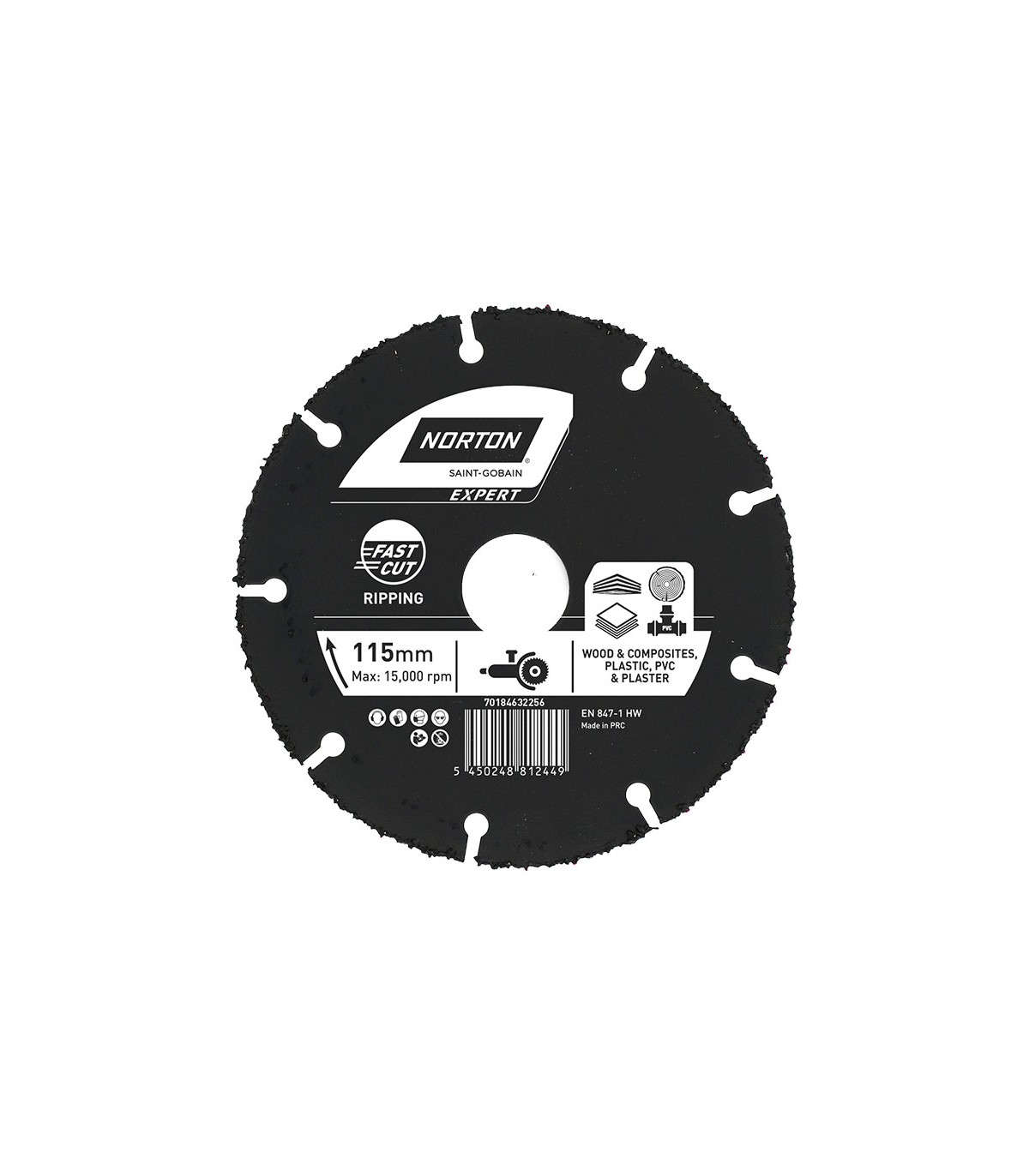 Disco con segmentos de carburo electrodepositados para corte rápido. Apto para cortar madera con clavos, composites, plástico, PVC y yeso.