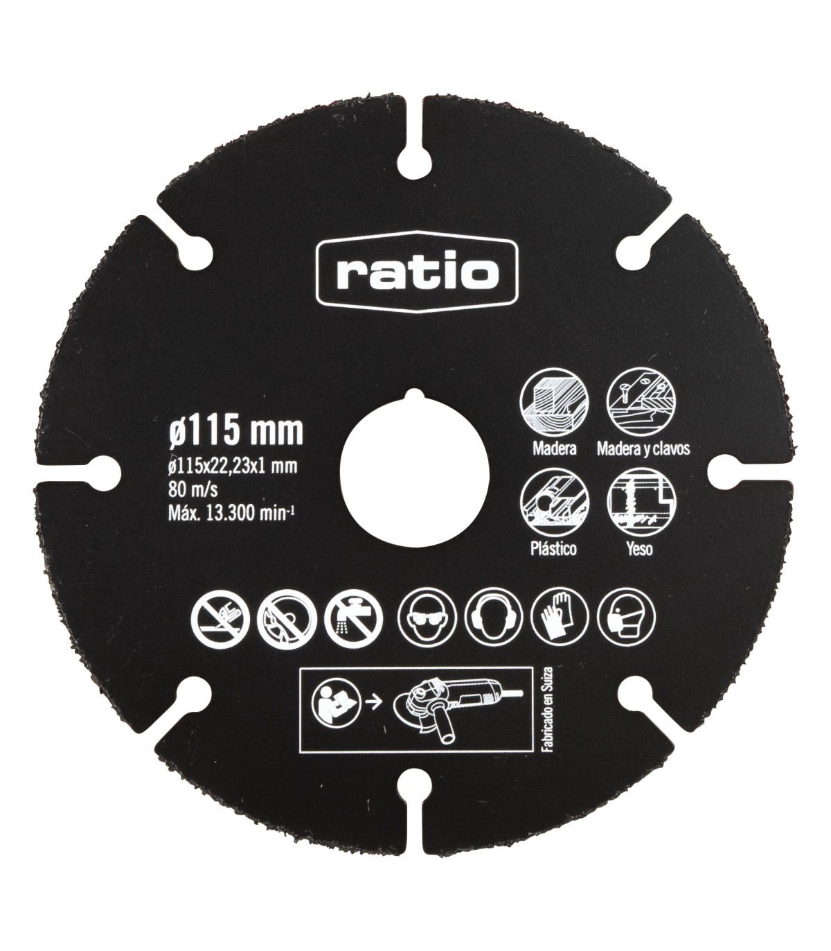 Con borde de carburo de tungsteno para corte por abrasión y sin enganchones. Apto para cortar madera con clavos, madera, plástico, cartón-yeso.. Norma EN-13236.
