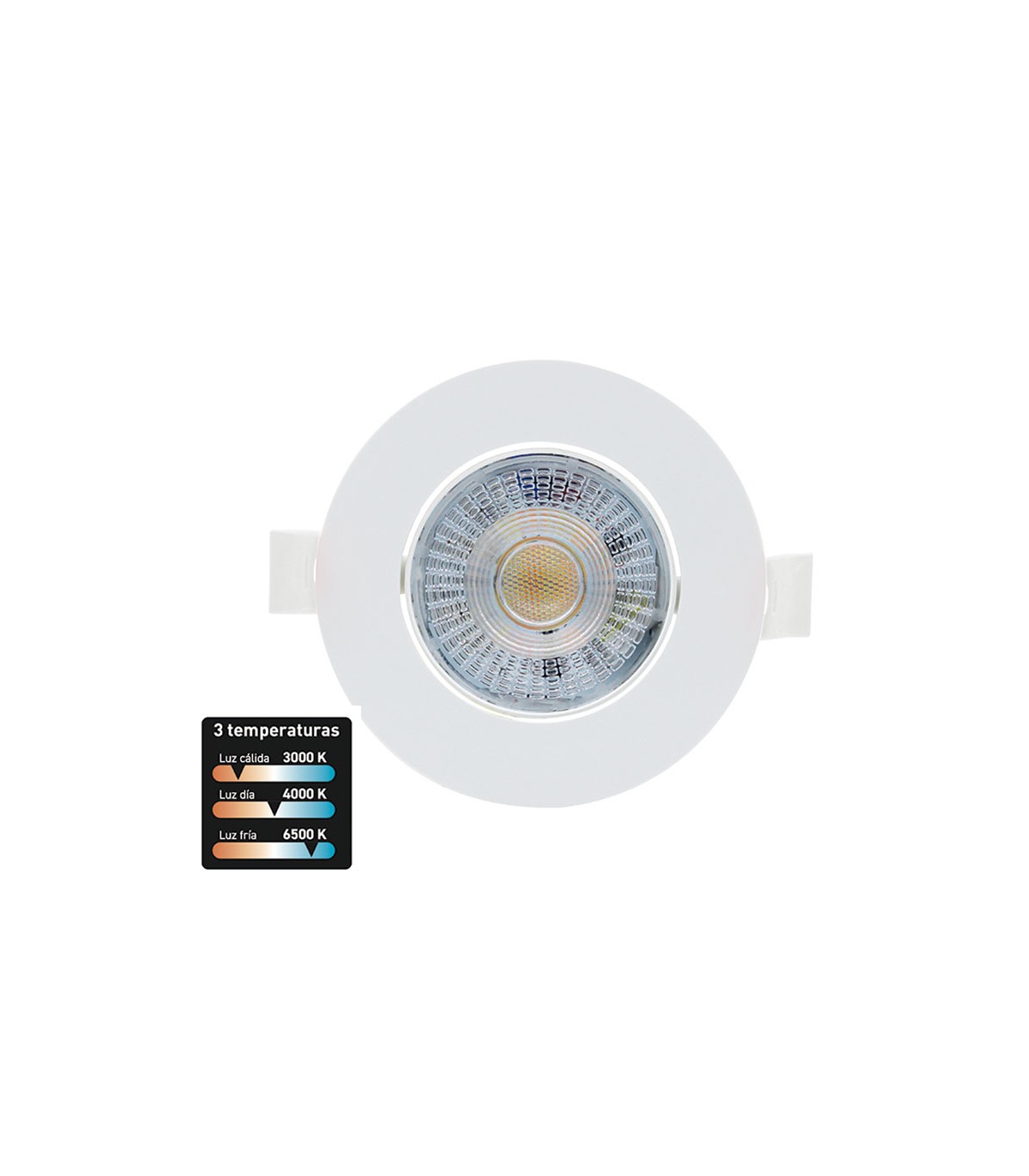 Empotrable. Estructura de plástico. 3 temperaturas de color: 3000-4000-6000K y 3 potencias: 3-5-7 W. Una referencia con 9 modos distintos. 220-240 V.