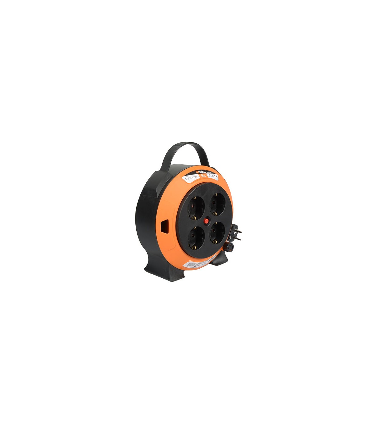 4 tomas T/T lateral. Cable HO5VV-FF 3G1.5. Interruptor de protección térmica. Potencia máxima admisible cable desenrollado 1.000 W. Tensión 16A/250V.