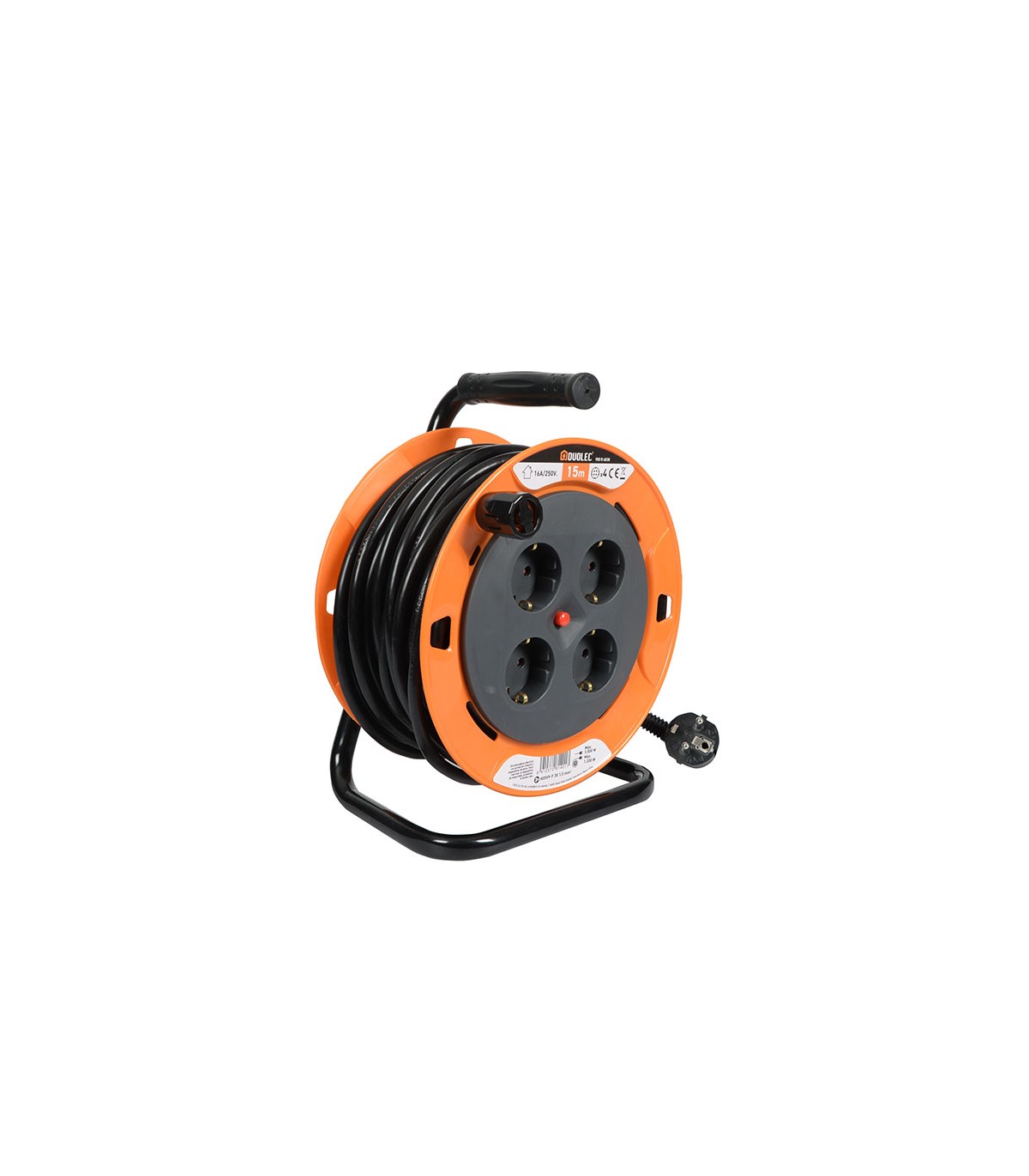 4 tomas T/T lateral. Cable H05VV-F 3G1.5. Interruptor de protección térmica. Potencia máxima admisible cable desenrollado 3.000 W. Cable enrollado 1.000 W. Tensión 16A/250V. Protección infantil. Tirador extensible. Placa para fijar el carrete durante el transporte. IP20.