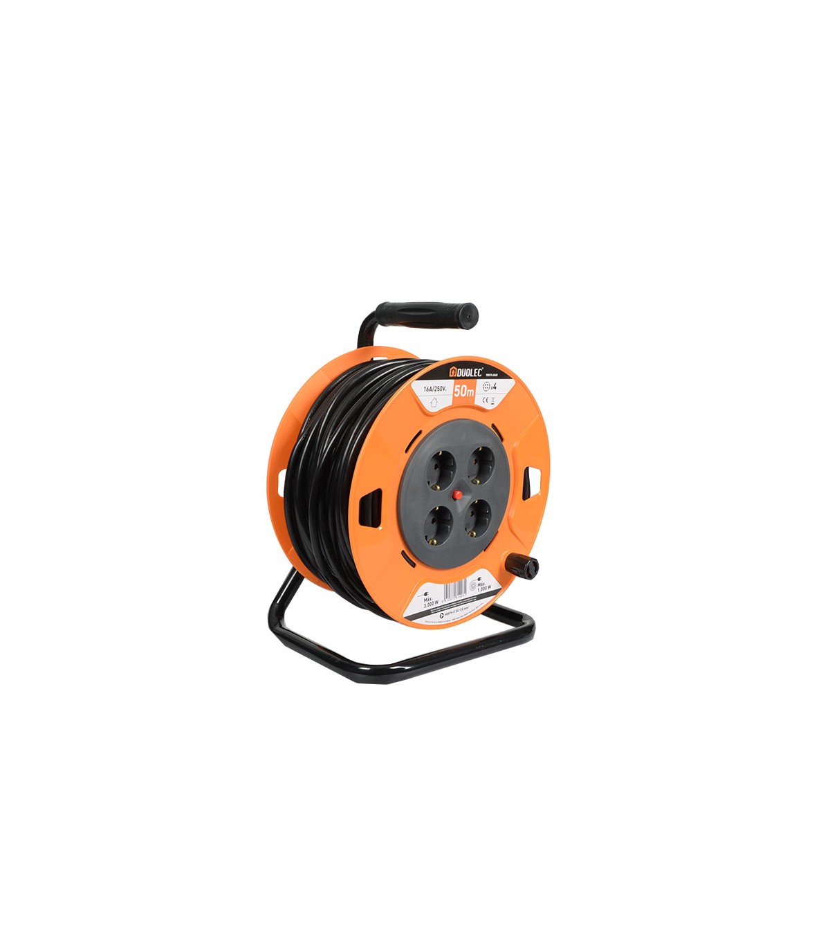 4 tomas T/T lateral. Cable H05VV-F 3G1.5. Interruptor de protección térmica. Potencia máxima admisible cable desenrollado 3.000 W. Cable enrollado 1.000 W. Tensión 16A/250V. Protección infantil. Tirador extensible. Placa para fijar el carrete durante el transporte. IP20.