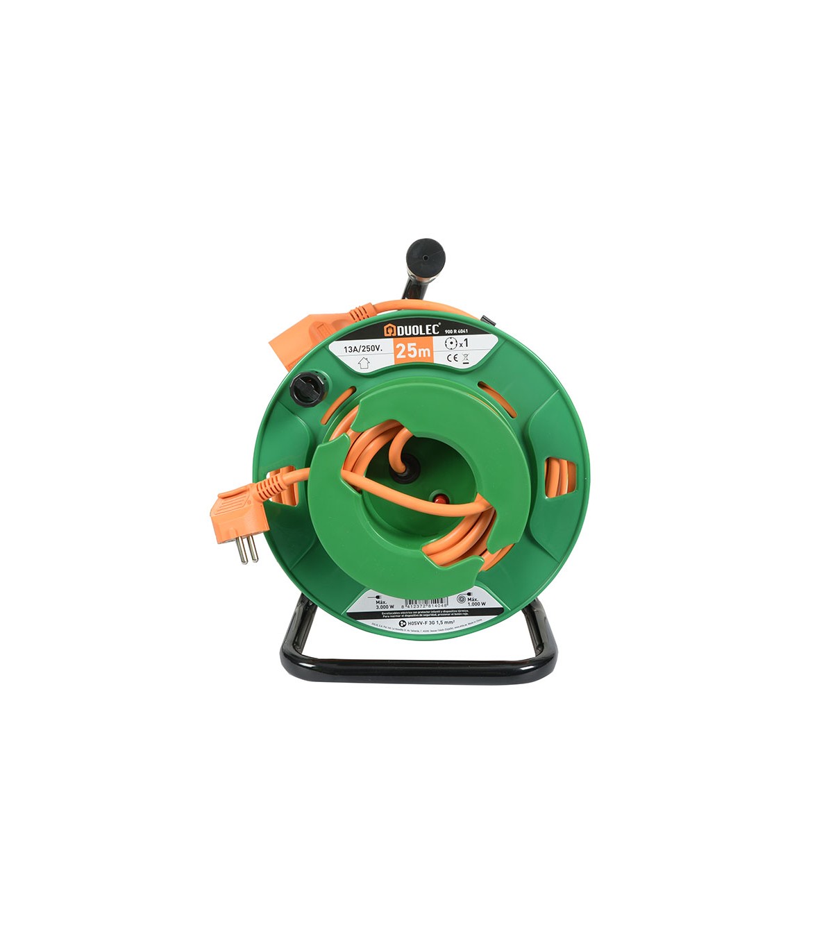 1 toma T/T lateral. Cable H05VV-F 3G1.5, color naranja. Interruptor de protección térmica. Potencia máxima admisible cable desenrollado 3.000 W. Cable enrollado 1.000 W. Tensión 13A/250V. Protección infantil.