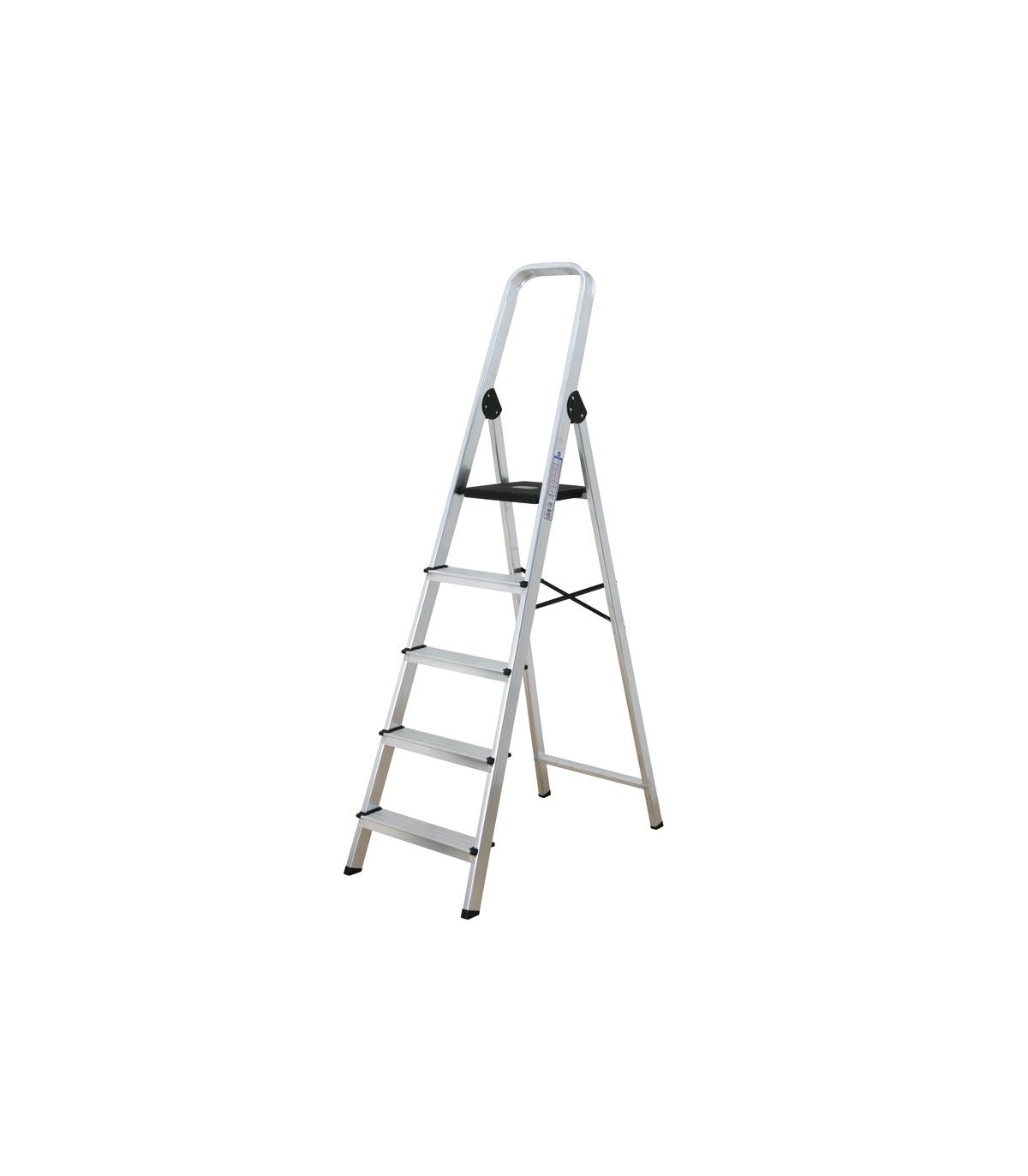 Aluminio tubo cuadrado. Norma UNE-EN 131. Peldaños antideslizantes. 80 mm. Plataforma polipropileno con relieves antideslizantes y seguro cierre.