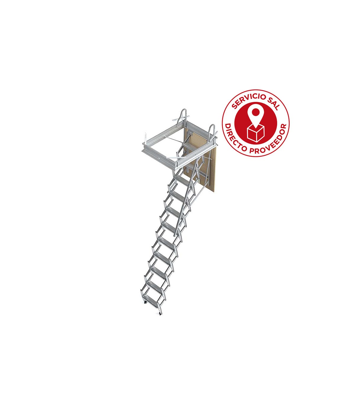 Tipo tijera compuesta por 11 peldaños, realizada en chapa de acero estampado protegido por electrogalvanizado. Totalmente ensamblada. Carga 150 kg.