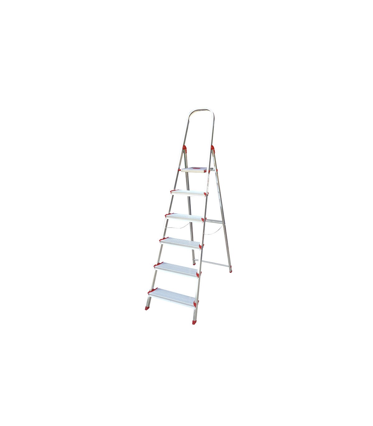 Aluminio. Resistencia de carga: 150 kg. Certificada por AENOR. Cable de acero para limitar apertura. Peldaños antideslizantes y extra-ancho (120mm). Rellano con sistema de seguridad. Arco de apoyo (altura de seguridad: 60cm).