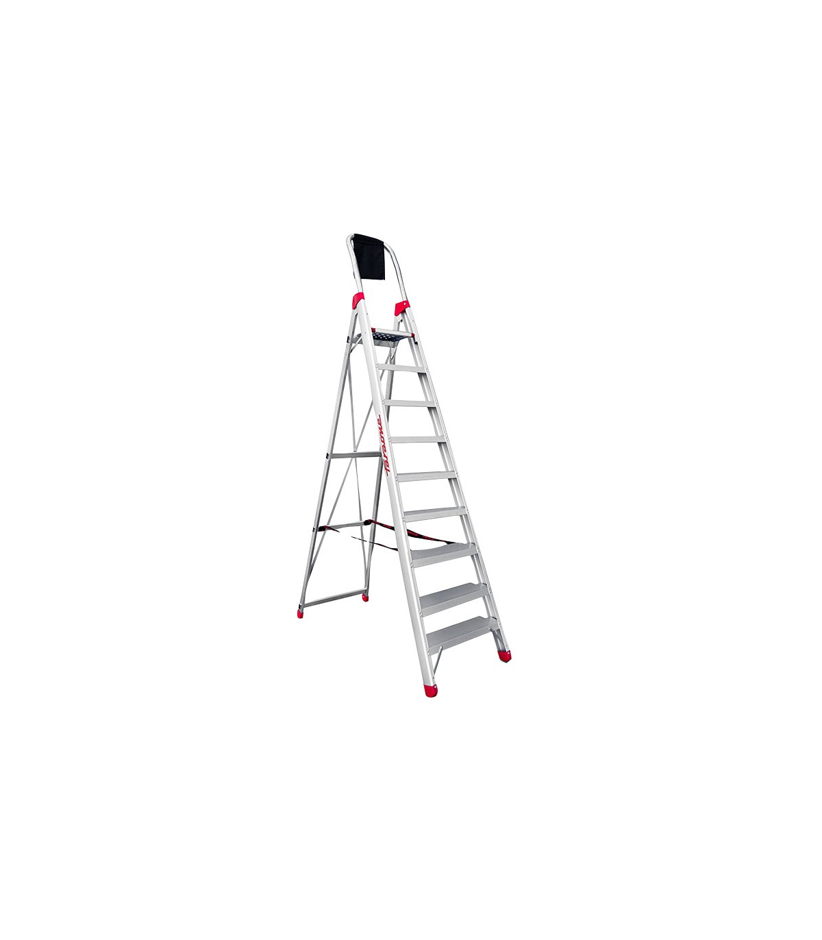 Aluminio. Montantes especiales tipo C. Peldaños 130 mm ancho. Ruedas retráctiles. Carga máxima 150 kg. Cumple normativa EN 131-1,2,3.