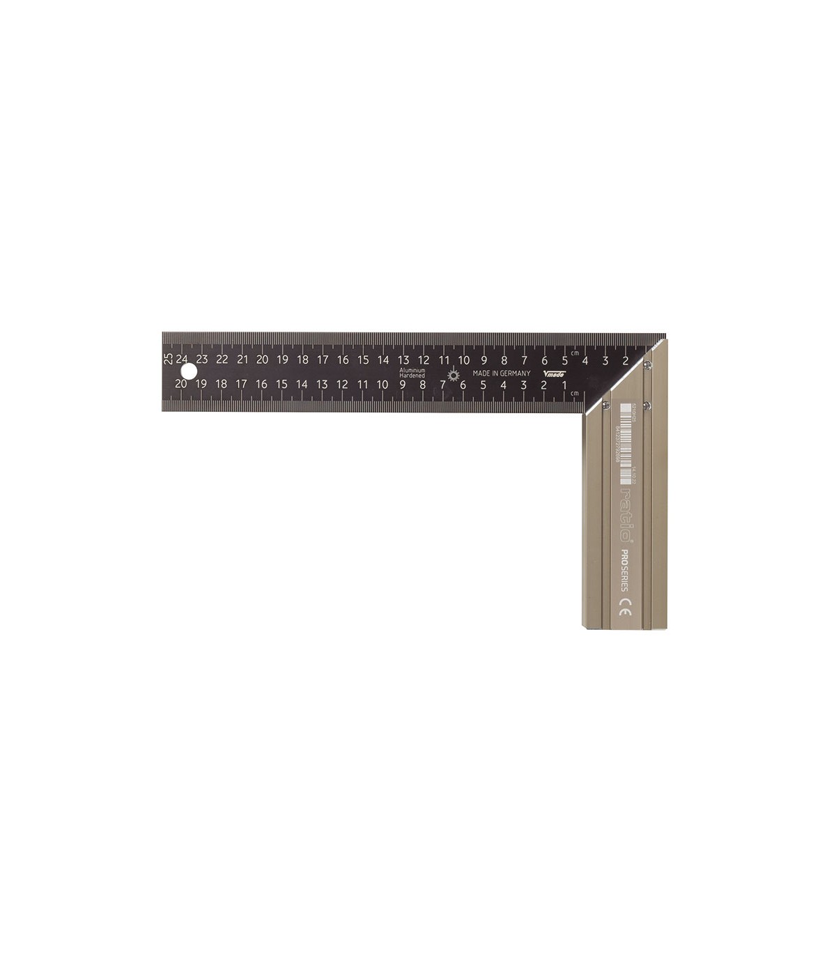 Hoja de aluminio anodizado negro, lectura antideslumbrante. Mango de aluminio anodizado con ranuras de perfil a inglete de 45º. Graduación en la parte delantera y trasera. Escala grabada con láser para una lectura clara.