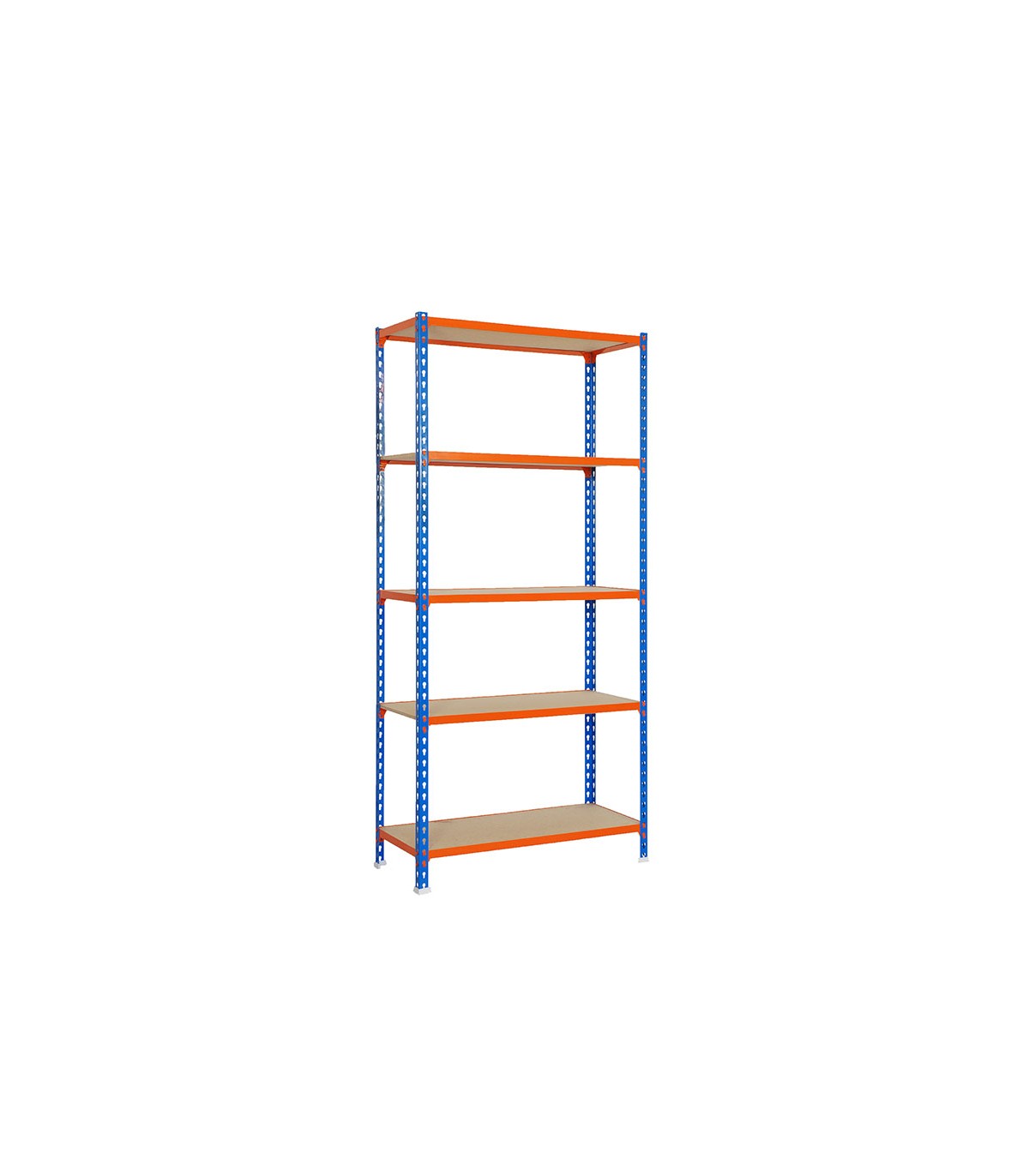 5 estantes madera aglomerada 12 mm grosor. Sin tornillos, sistema fácil y rápido de. montaje. Con acceso libre a todos los estantes. Sin aspas de arriostramientos. Requiere. anclaje a la pared. Capacidad de carga 150 kg/ estante. Azul/naranja.
