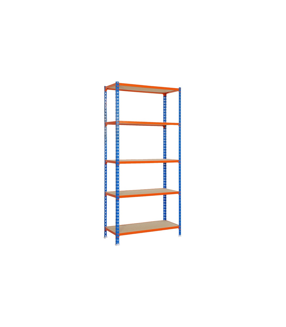 5 estantes madera aglomerada, 12 mm grosor. Sin tornillos, incluye 4 pies de plástico.. Fabricado en España. Capacidad de carga: 200 kg/estante. Azul/naranja.