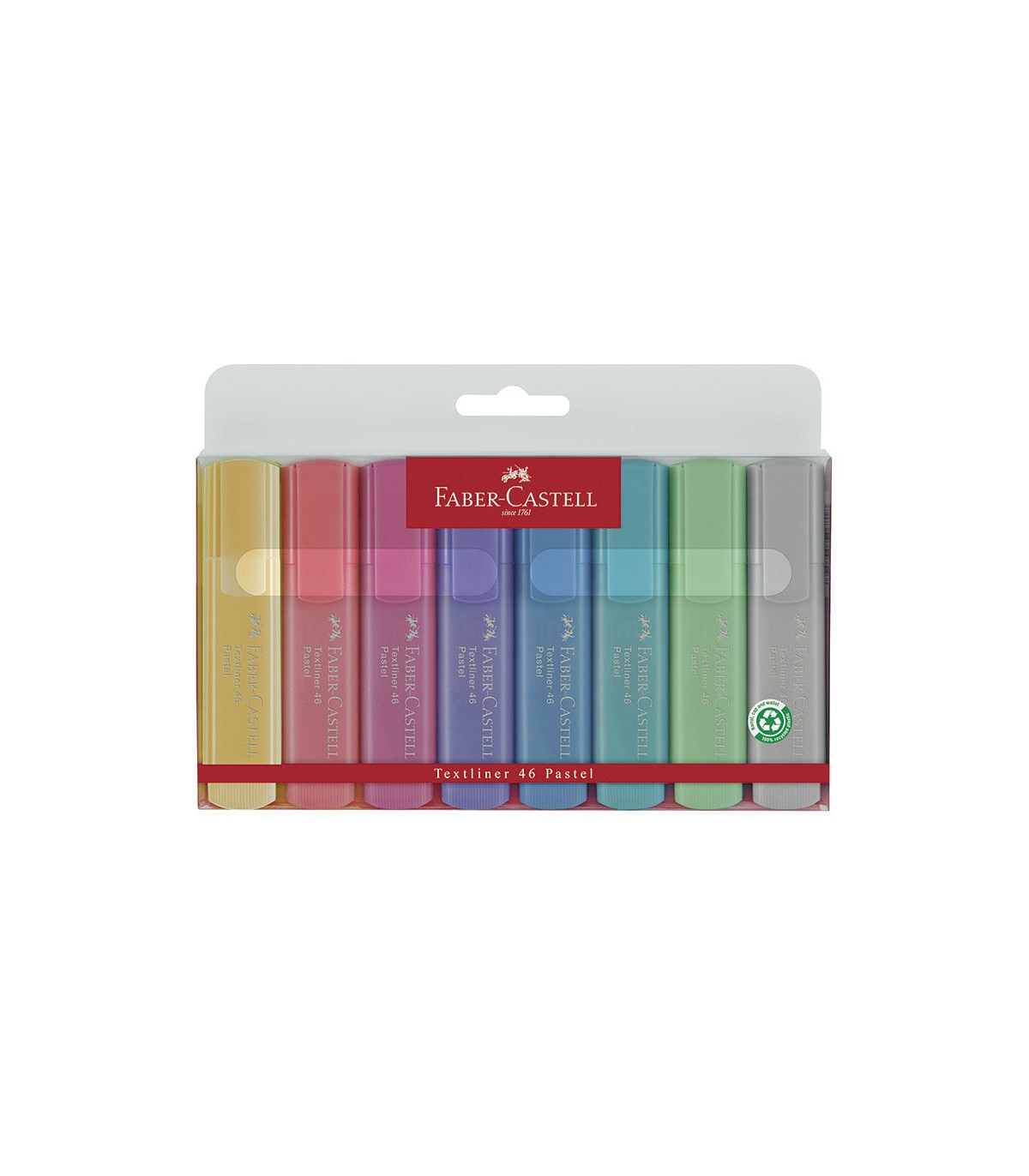 Para papel normal y especial. Tinta a base agua. Punta biselada en 3 grosores de trazo: 5, 2 y 1 mm. Colores pastel surtidos.