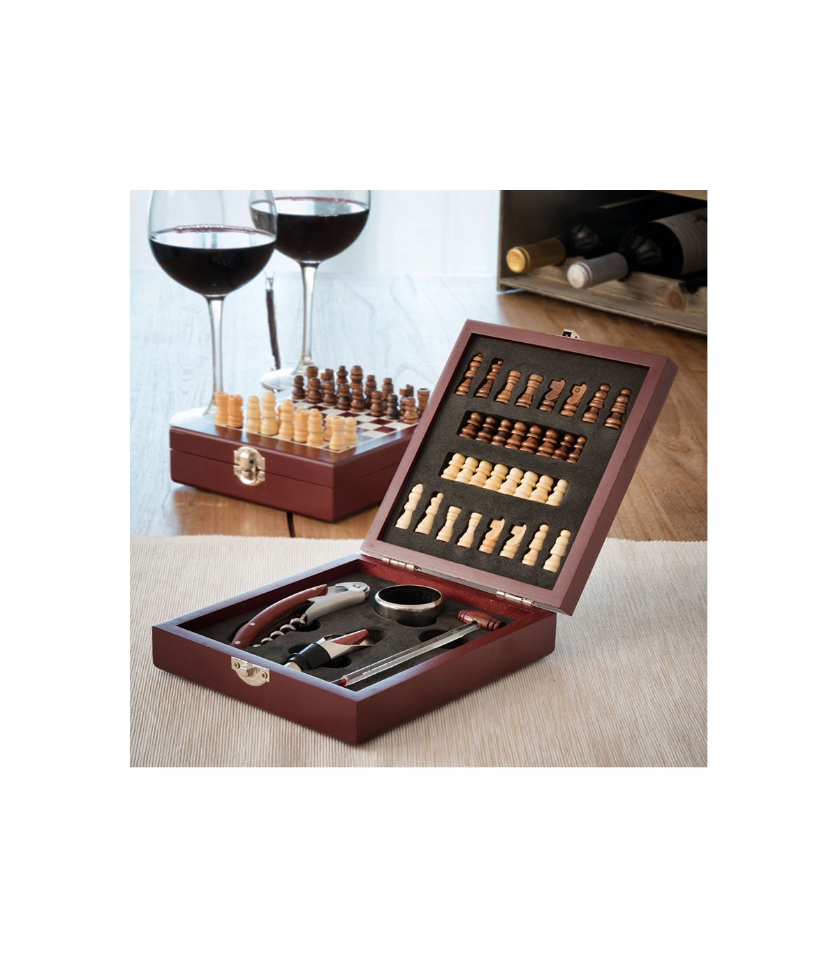 Fabricado de madera y acero inox. Incluye: tapón dosificador, anillo antigoteo, termómetro,. sacacorchos con cortaprecintos y abrebotellas, 32 piezas de ajedrez. .