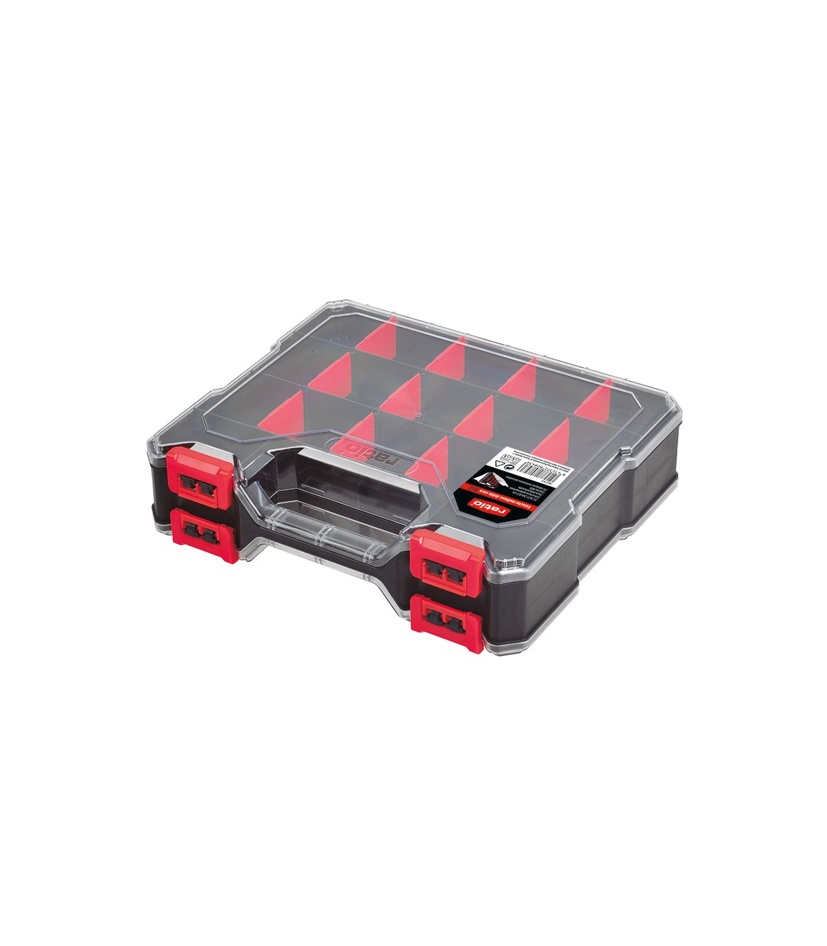 Estructura de polipropileno, tapa transparente de policarbonato y cierres en ABS. Tabique modular extraíble para personalizar los compartimentos. (total 24 tabiques)