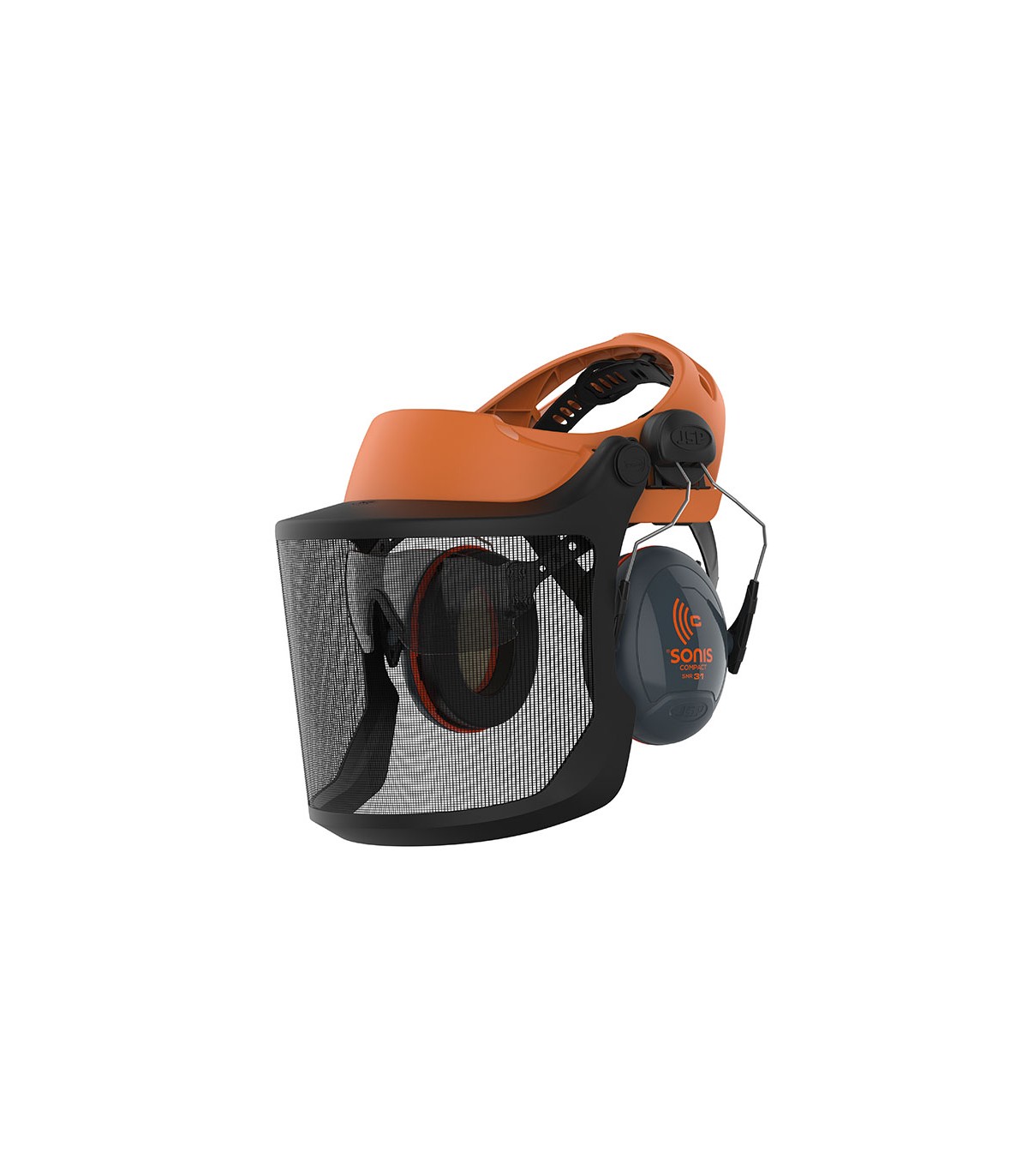 Sistema de cascos. Ajuste multi-posición de 6 puntos. Marco ABS y malla tejida de acero inox. Protección de doble capa contra impactos.
