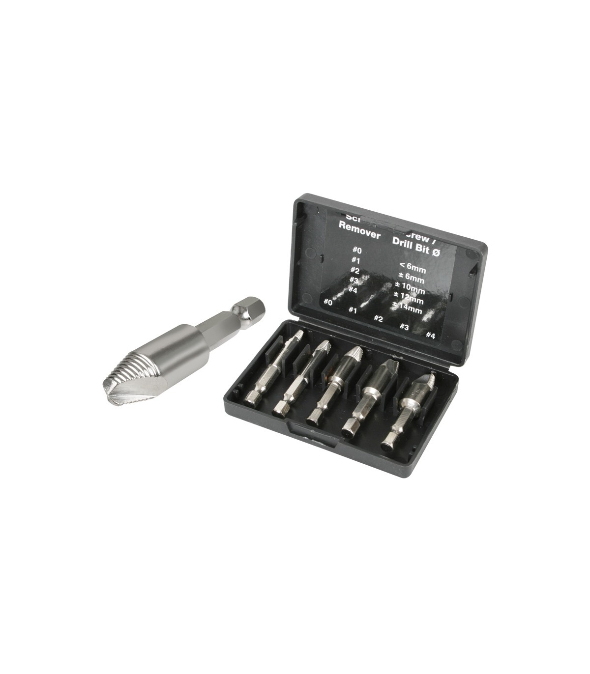 Juego 5 unidades. Acero HSS. Retira fácilmente tornillos rotos, dañados o incrustados. Estuche plástico.