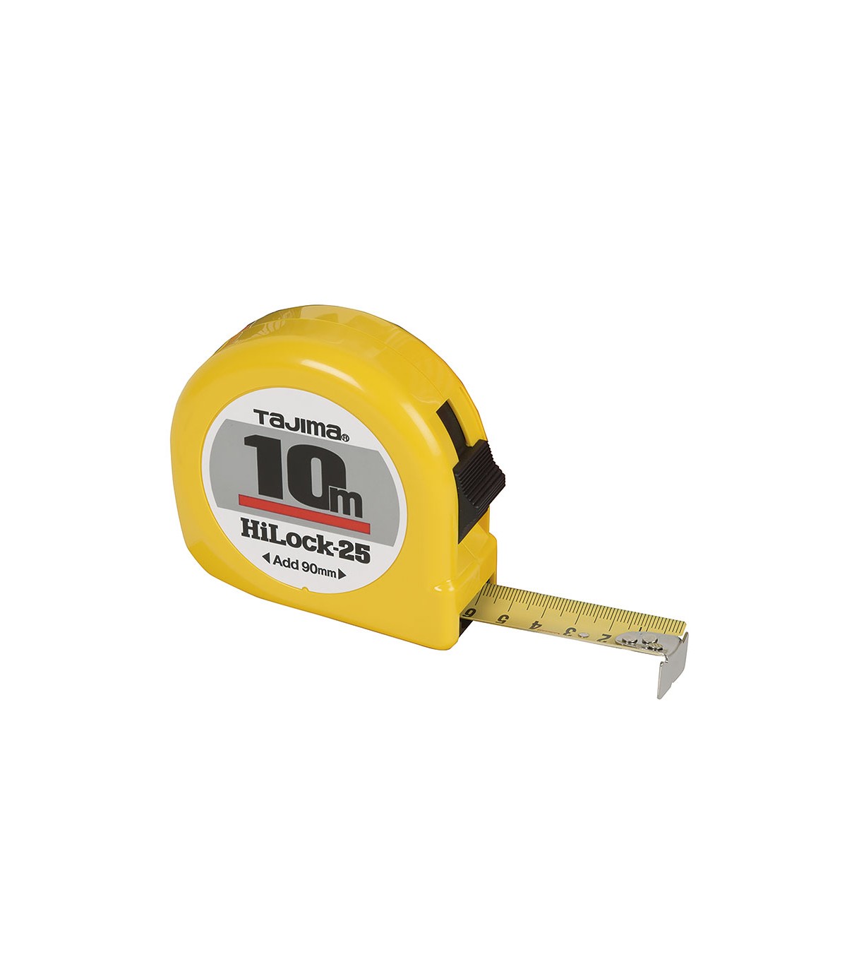 Caja plástico ABS. Cinta acero esmaltado amarillo. Clip sujeción y botón de bloqueo. Homologado CE. Clase de precisión II..