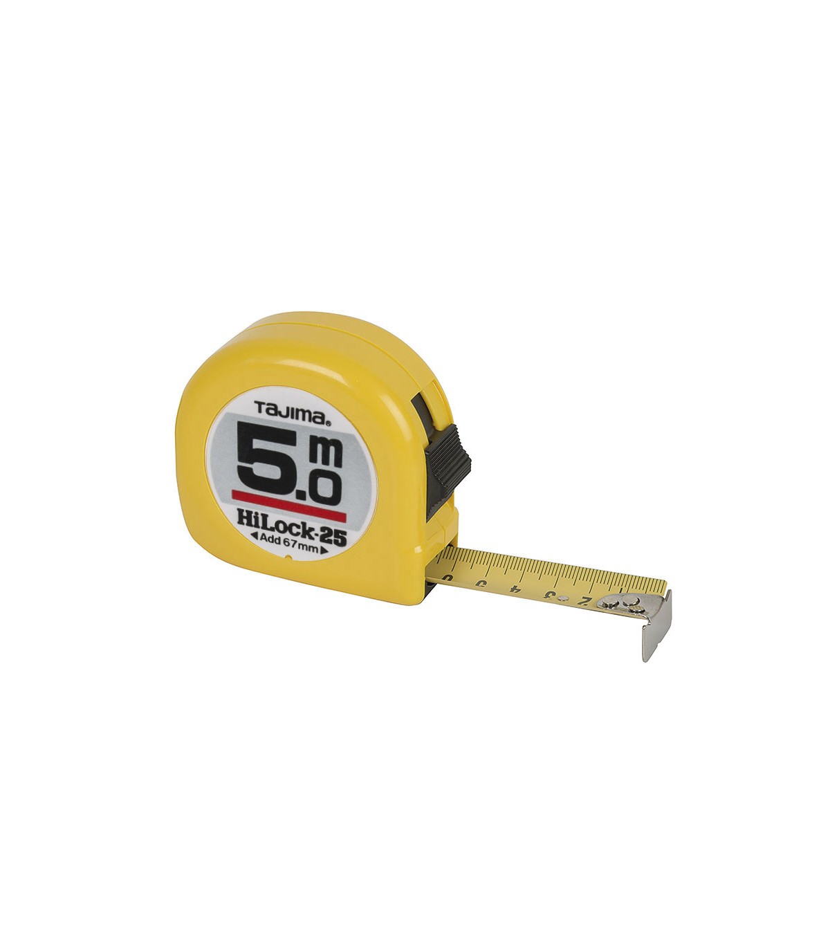 Caja plástico ABS. Cinta acero esmaltado amarillo. Clip sujeción y botón de bloqueo. Homologado CE. Clase de precisión II..