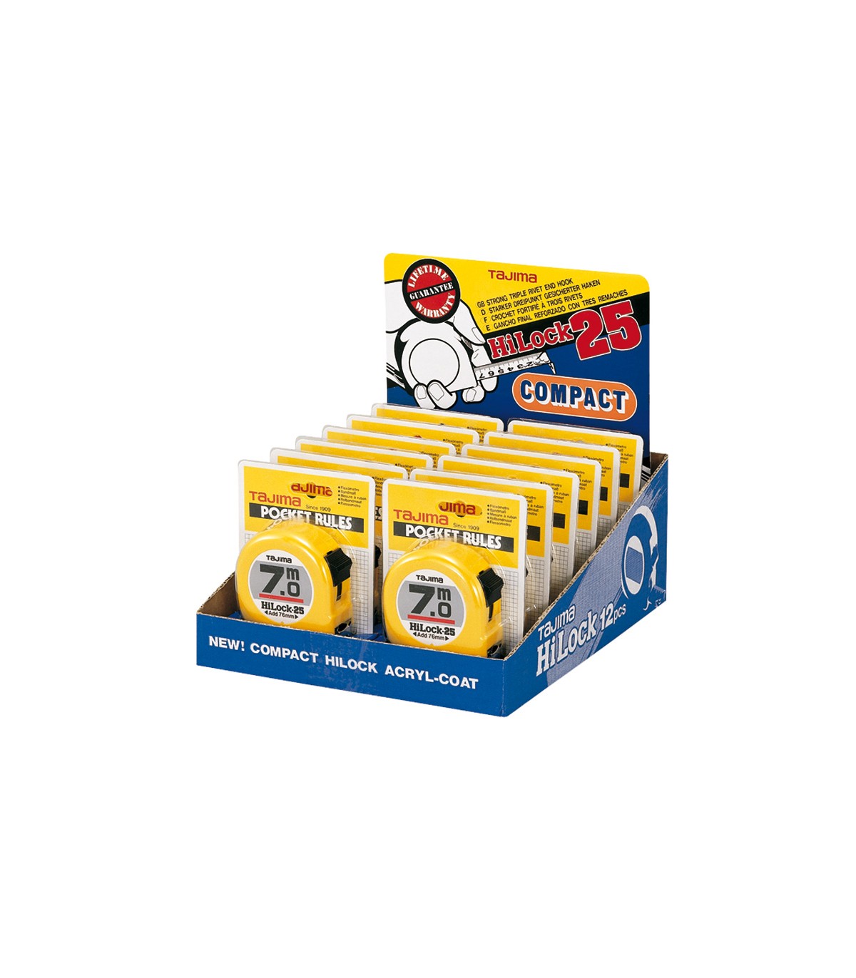 Caja plástico ABS. Cinta acero esmaltado amarillo. Clip sujeción y botón de bloqueo. Homologado CE. Clase de precisión II..