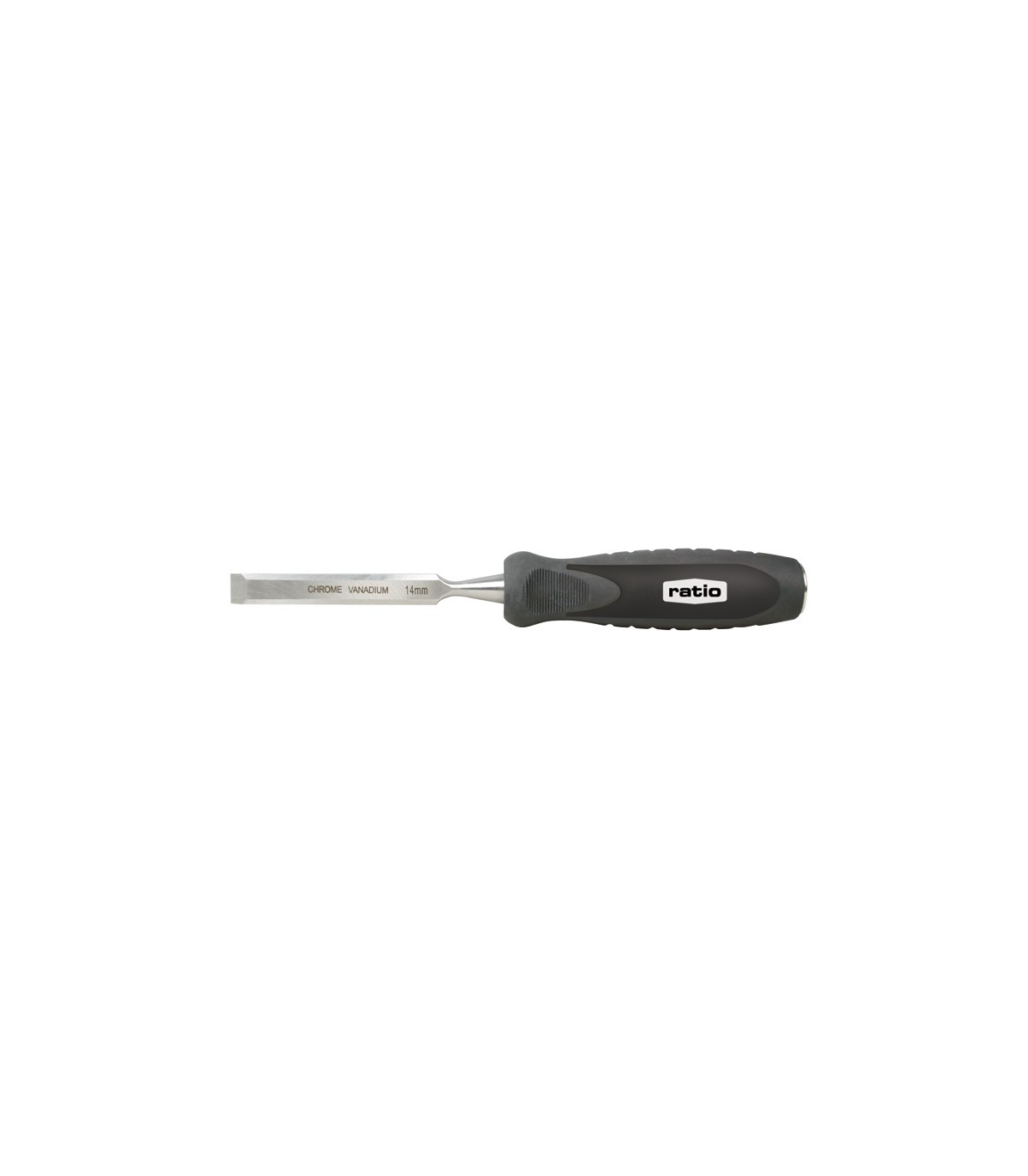 Acero cromo-vanadio forjado con tratamiento térmico, dureza 58-62HRC. Cantos biselados. Mango bimaterial antideslizante con cabezal metálico.