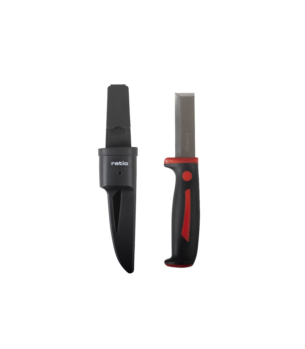 Hoja acero inox. Mango bimaterial antideslizante. Con funda polipropileno con pinza para cinturón. Apto para tallar o cortar madera. Usos: construcción, jardinería y hogar.