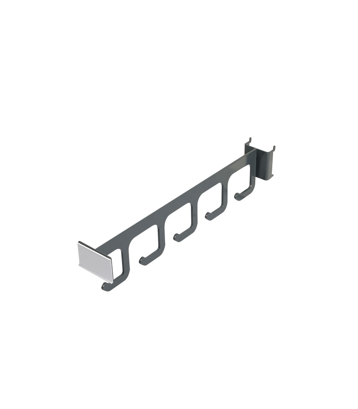 Anclaje universal sobre panel perforado de 25 mm. Ideal para ahorro de espacio en exposición de sartenes, niveles, vestuario.