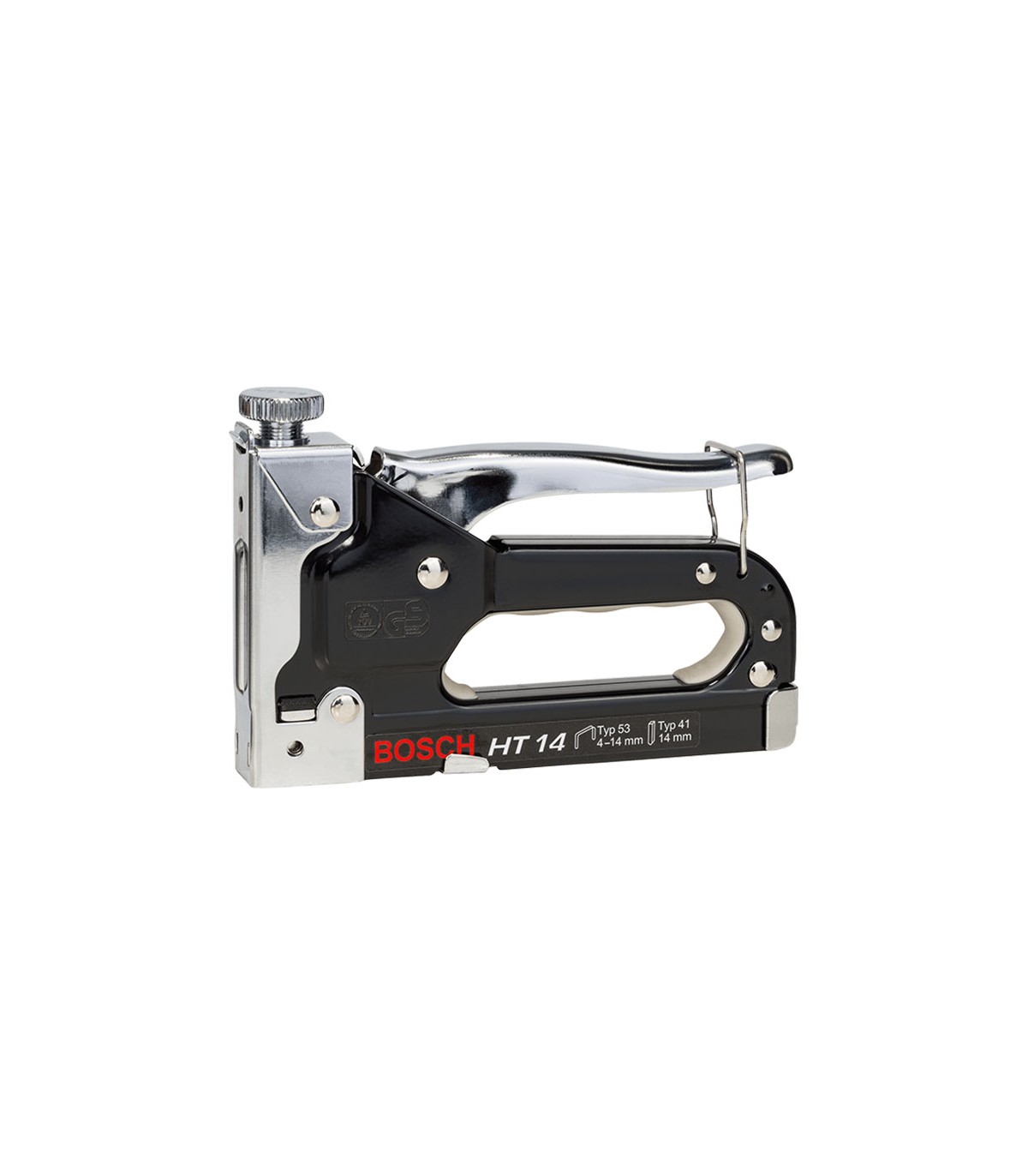 Indicada para la fijación rápida de tejidos, cartón alquitranado para tejados, papel, materiales aislantes, telas metálicas y trabajos ligeros de tapizado Grapadora universal de ejecución sólida, totalmente en acero, con regulación continua de la fuerza de percusión, vaciado acolchado de la empuñadura, fijación de la empuñadura.