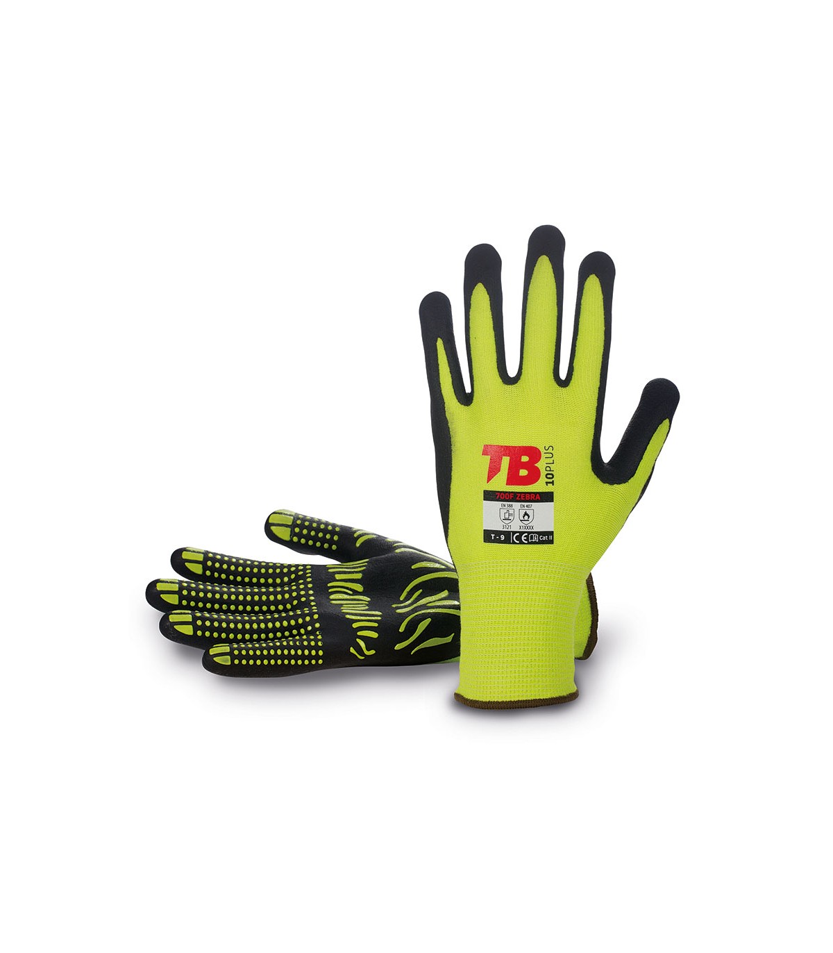 Algodón y elastano amarillo sin costuras. Recubrimiento nitrilo foam negro en palma. Puño elástico. Grip PVC diseño Zebra en palma. Usos: automoción, logística, mecánica, carga y descarga, etc. Cat II EN388 EN 407.