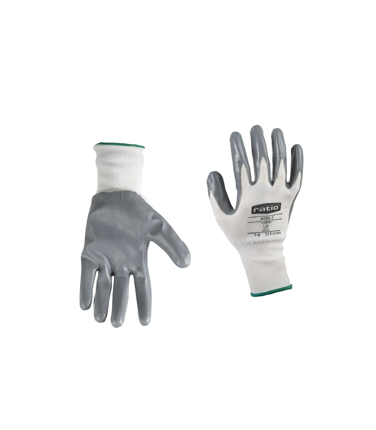 Poliéster blanco sin costuras. Recubrimiento nitrilo gris en palma. Puño elástico. Resistencia a abrasión. El soporte sin costuras proporciona ergonomía y no provoca fatiga. Usos: agricultura, automoción, logística, mecánica, montaje. Cat II EN 388.