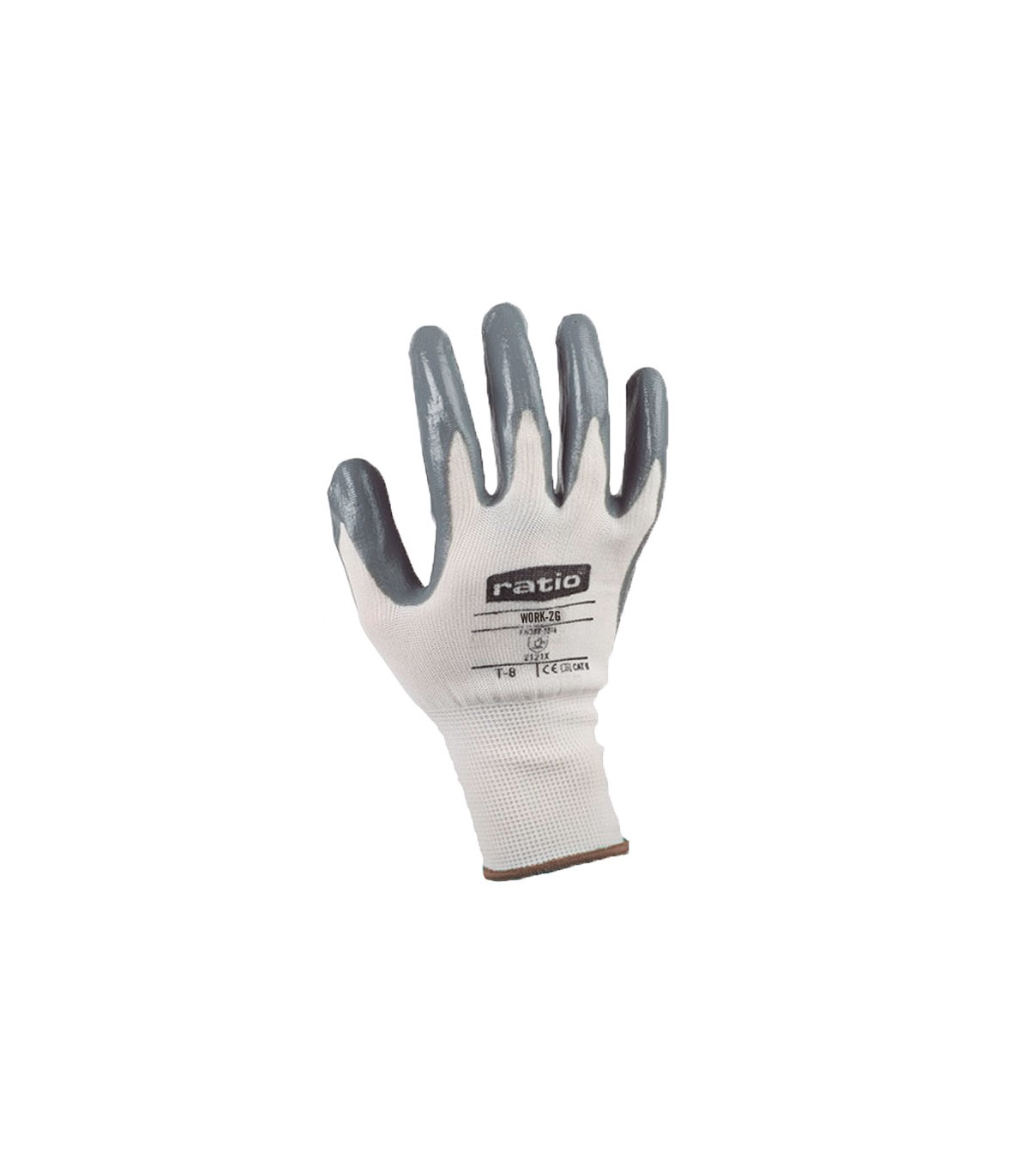 Poliéster blanco sin costuras. Recubrimiento nitrilo gris en palma. Puño elástico. Resistencia a abrasión. El soporte sin costuras proporciona ergonomía y no provoca fatiga. Usos: agricultura, automoción, logística, mecánica, montaje. Cat II EN 388.