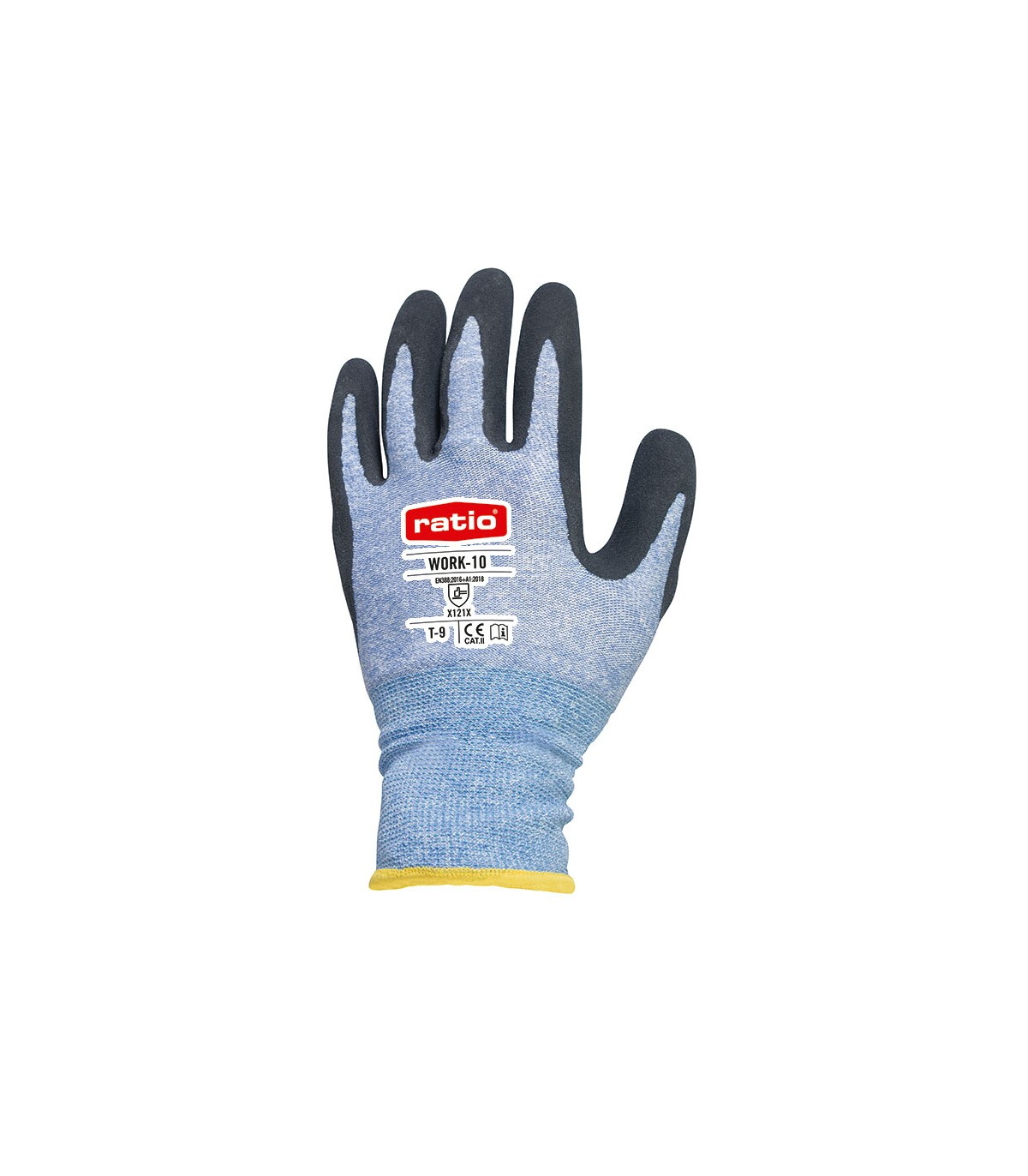 Poliéster reciclado con spandex recubierto de látex arenoso en la palma. Uso: manipulaciones sin riesgo de corte que requieran tacto, cadenas de montaje, automoción, logística y almacén. Cat. II EN 388.