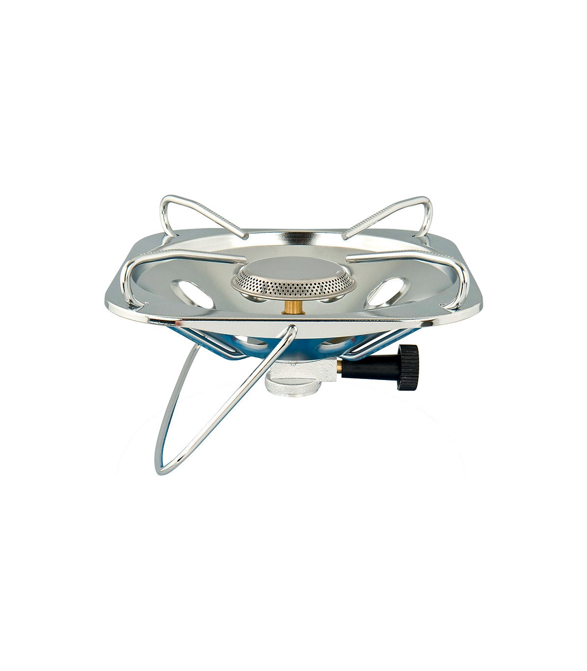 Conexión a bombona azul. Diseñada para soportar sartenes grandes y pesadas. Conexión directa a botella (no requiere regulador ni goma). Encendido manual.