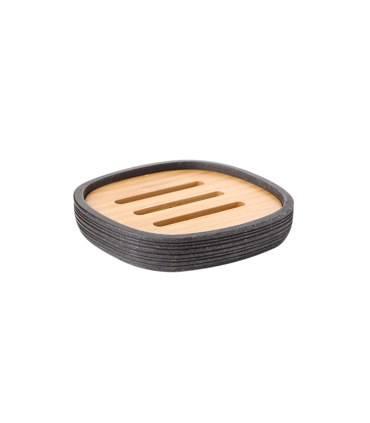Poliresina rayada gris oscuro, combinada con bambú y partes cromadas.