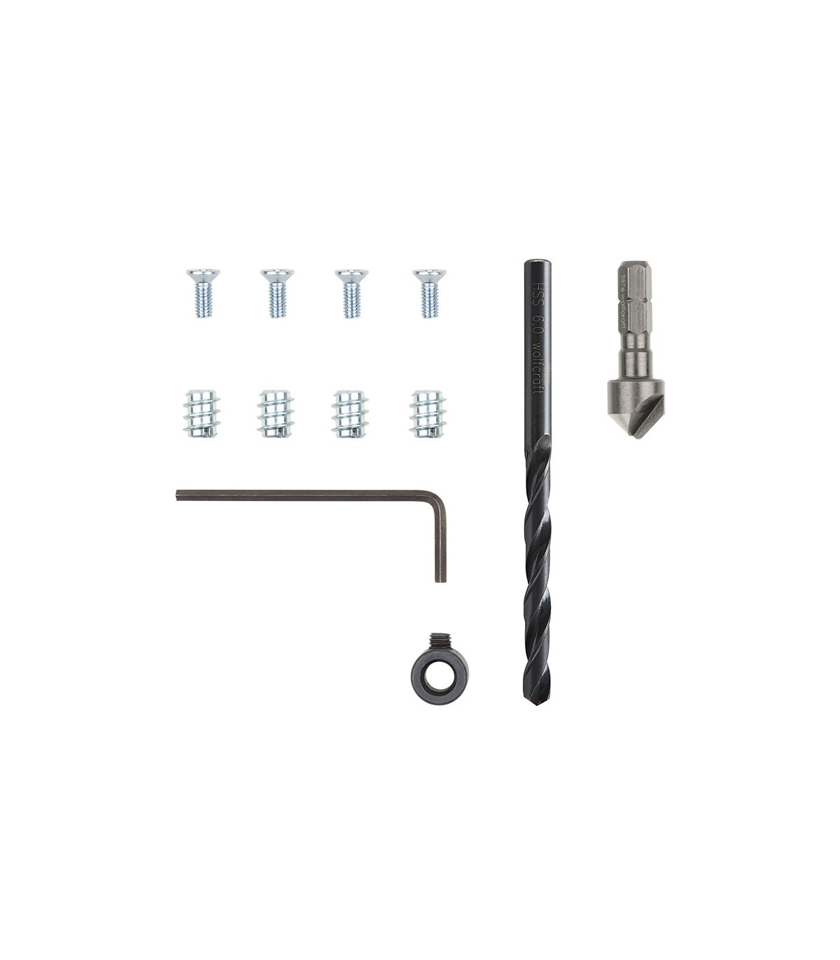 1 broca de HSS de forja por laminación, ø 6 mm. 1 tope de profundidad. 1 avellanador. 4 tuercas roscadas. 4 tornillos de cabeza avellanada. Cuerpo mueble.