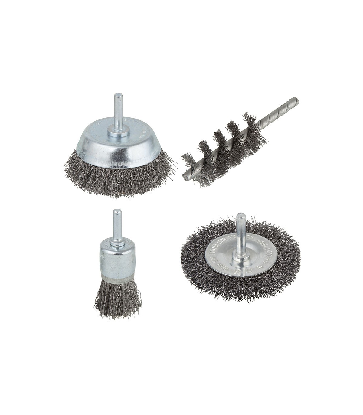 Para quitar óxido, eliminar pintura y limpiar. 1 cepillo de disco de alambre de acero, ø 75 x 10 mm. 1 cepillo de copa de alambre de acero, ø 75 mm. 1 cepillo cilíndrico de alambre de acero, ø 28 x 60 x 95 mm. 1 cepillo de pincel de alambre de acero, ø 25 mm.