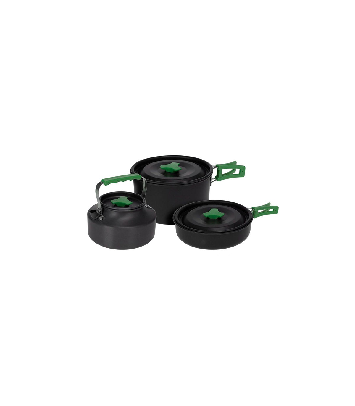 Juego 3 piezas especial camping. Aluminio anodizado con mangos acero inox. Cacerola con tapa 178x90 mm. + Sartén 180x43 mm. + Hervidor con tapa 151x75 mm. Mango plegable color verde.