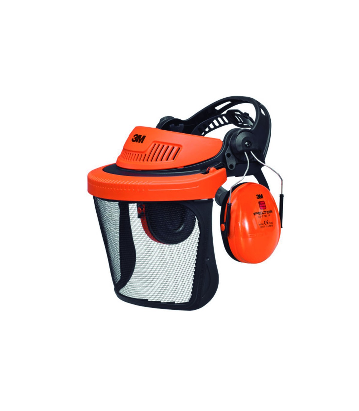 Protector para actividades forestales compuesto de arnés para casco, orejeras Peltor con anclaje P3E y pantalla de protección. Para actividades forestales y jardinería. Norma: EN 166:2001, EN 1731 y EN 352-3.
