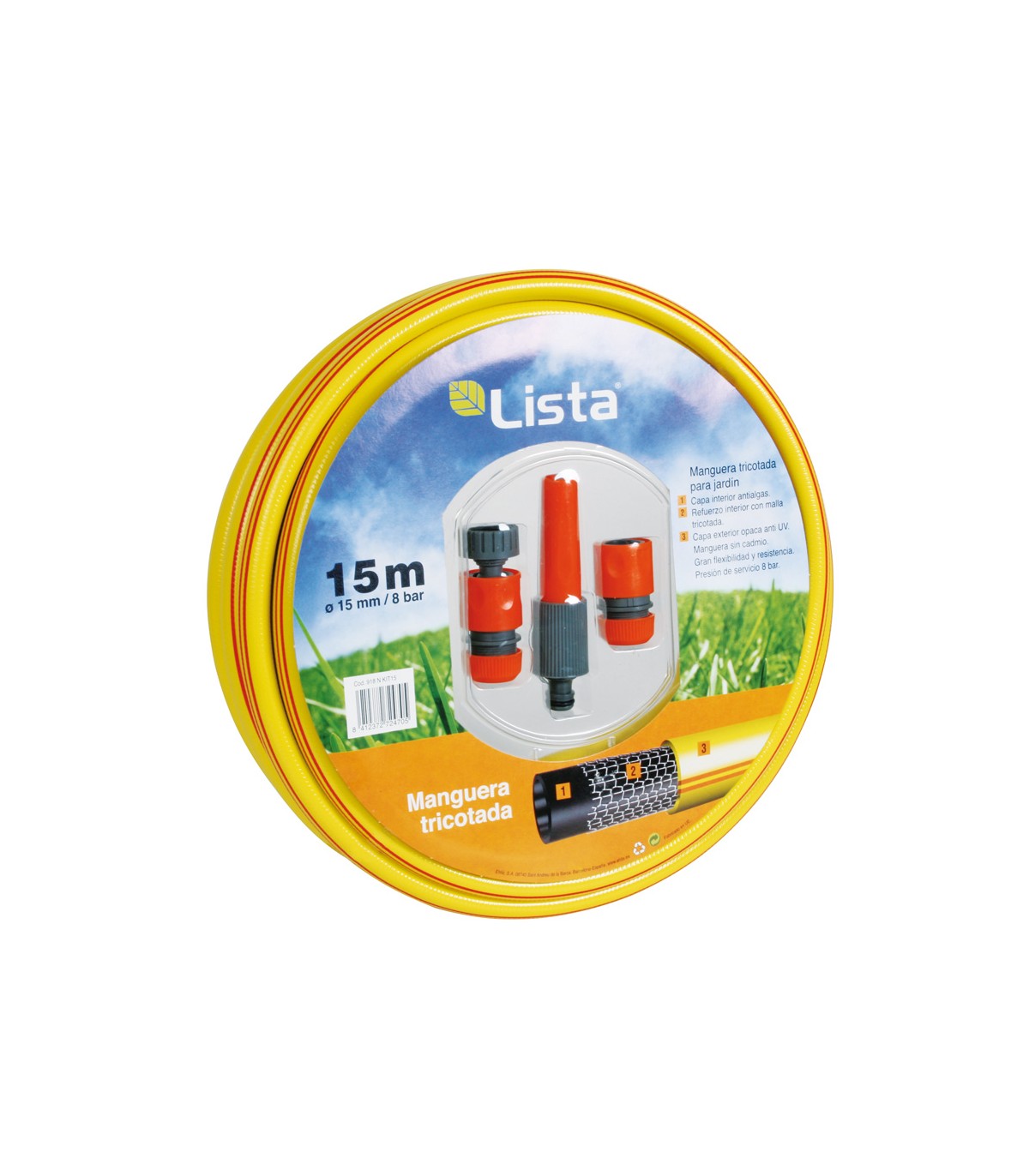 Conjunto conexiones: racor hembra, 2 conectores y lanza riego. Tricotada 3 capas. Atóxica. Antialgas. Presión de servicio 8 bares.