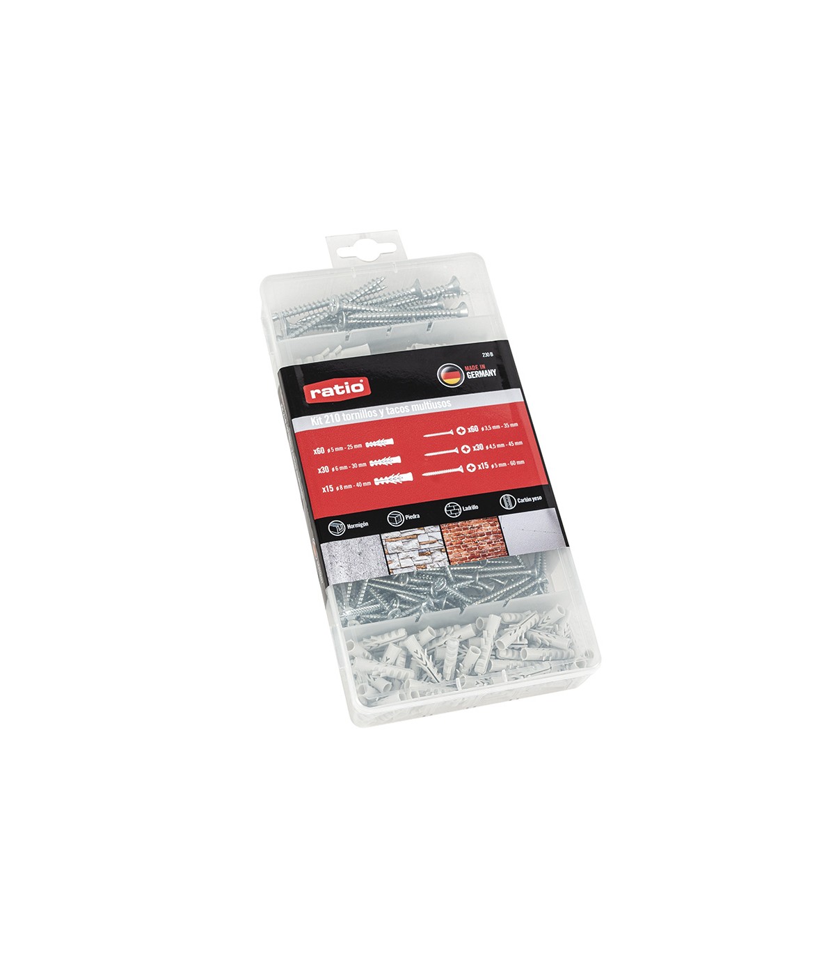 210 unidades surtidas. Tornillos cincados rosca aglomerado, cabeza plana Pozidrive y tacos de nilón multiusos. Uso en hormigón, piedra, ladrillo y cartón yeso.