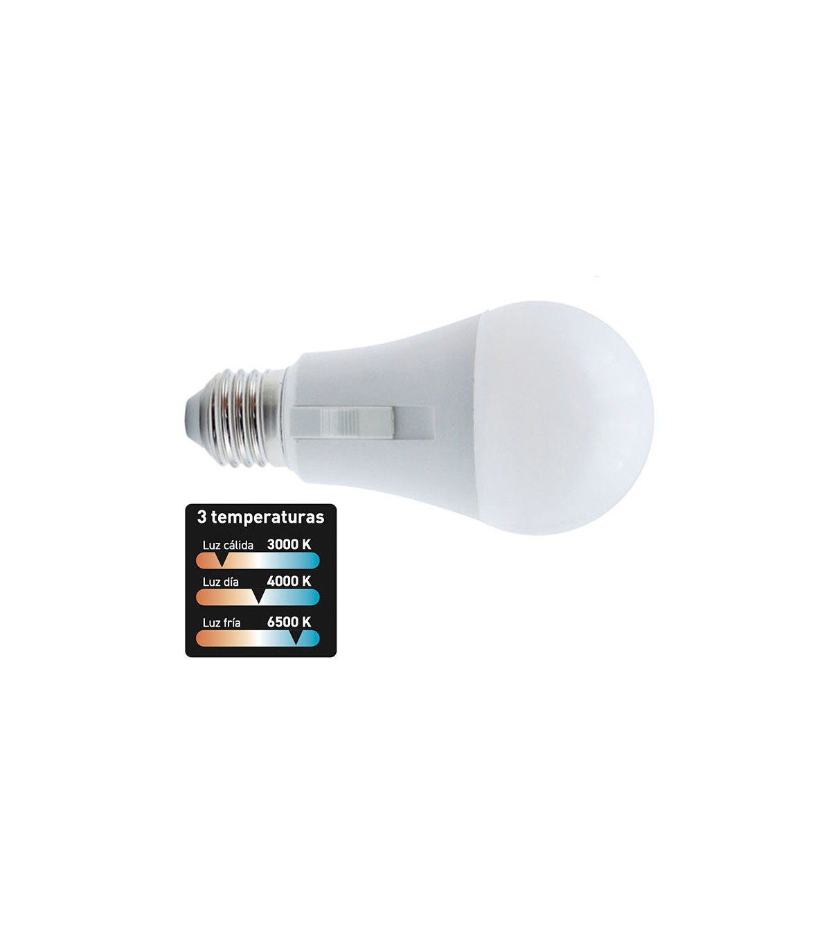 Rosca E27. Selector temperatura de calor: 3000-4000-6500K. 3 temperaturas de color (luz cálida, luz fría y luz día). Encendido instantáneo. Vida útil 25.000 h.