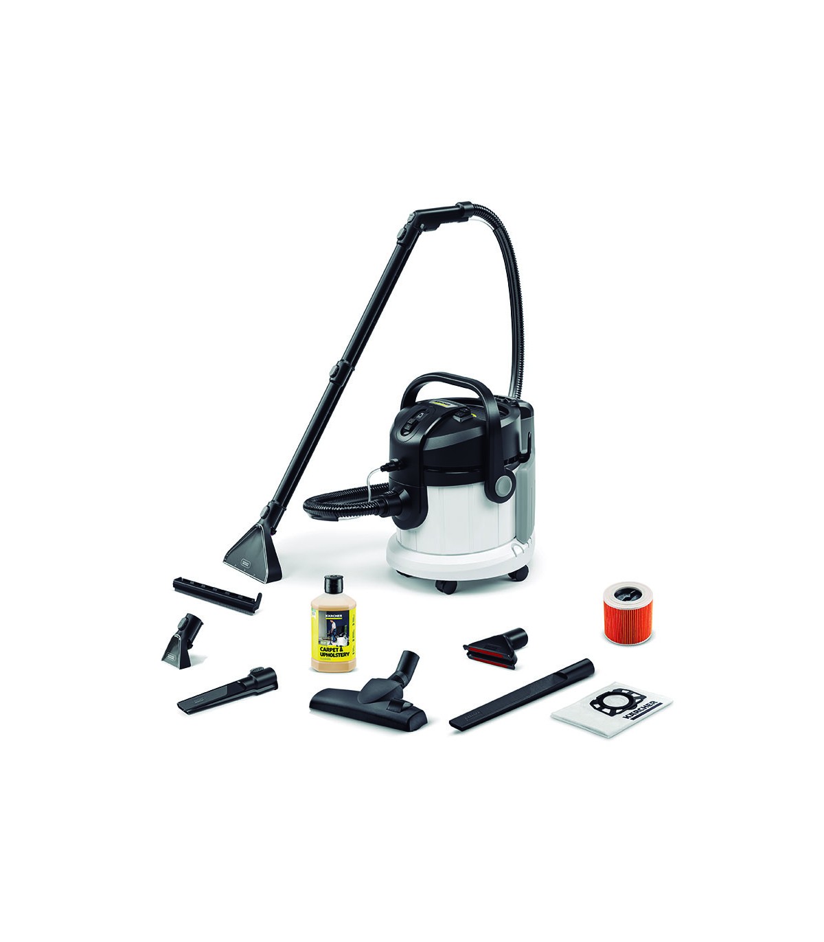 Limpia las superficies textiles de forma cómoda. Ideal para familias, personas alérgicas y hogares con mascotas. Incorpora manguera de pulverización y aspiración de gran flexibilidad. Accesorios incluidos: Boquilla para ranuras, boquilla de aspiración en seco, boquilla para tapicerías, detergente, filtros de cartucho y bolsa de filtro de fieltro.