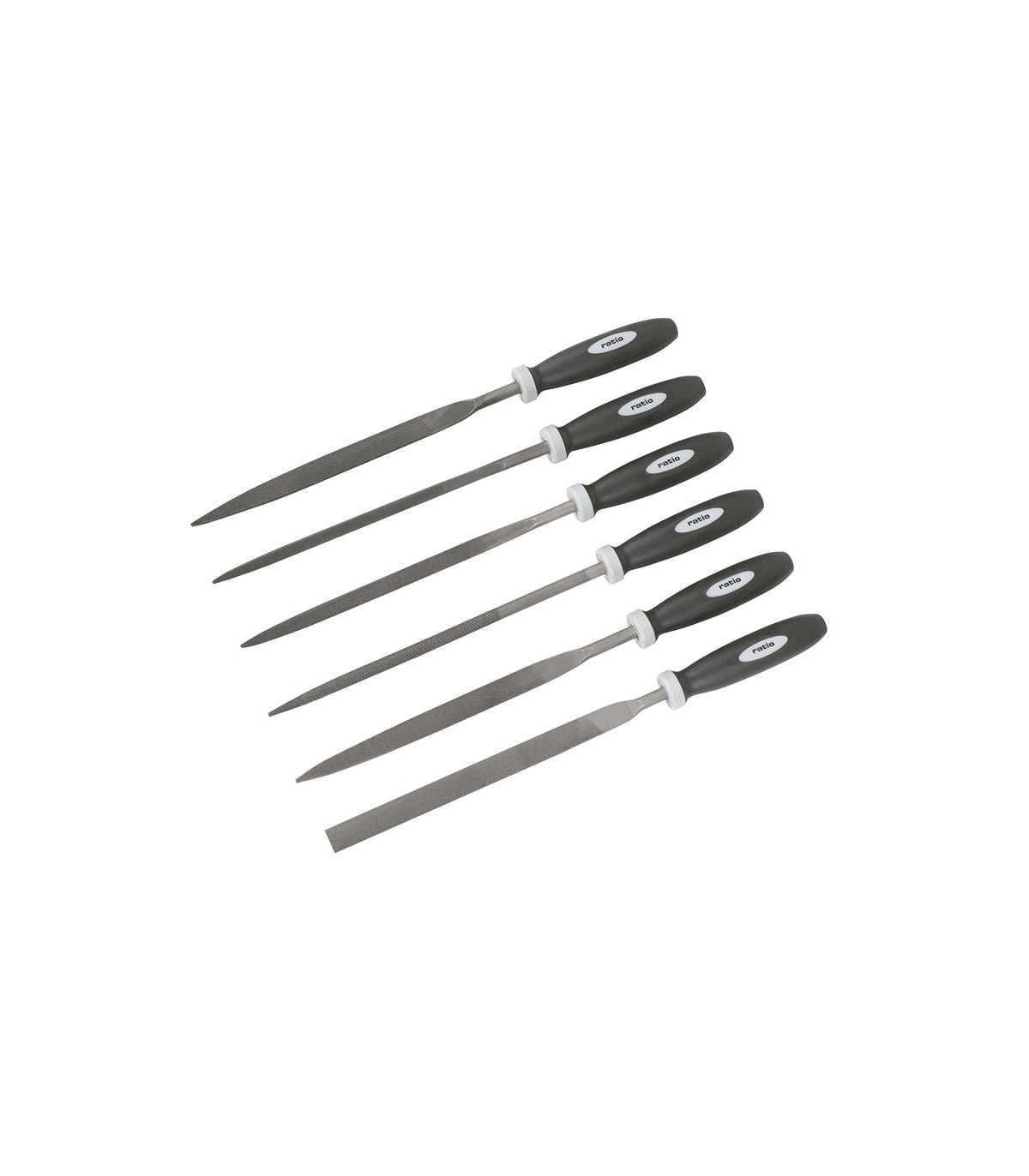 Mango bimaterial. Entrefinas. Juego 6 unidades: plano punta, cuadrado, triangular, plano paralelo, media caña y redondo.