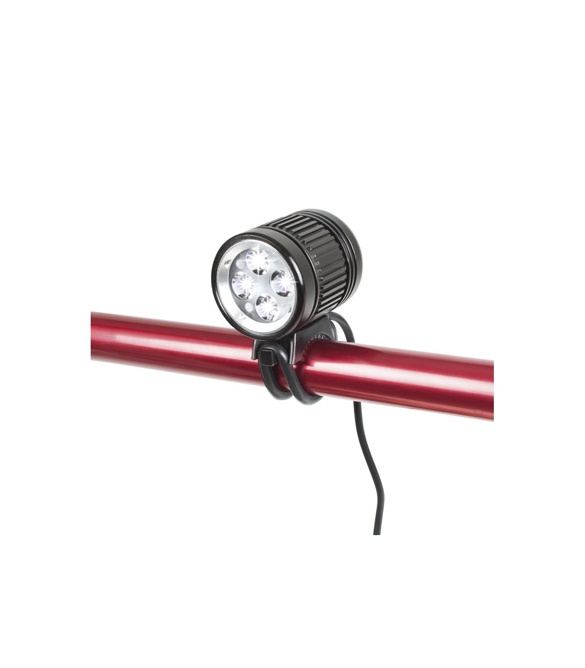 Cabezal de aluminio. 4 Led alto rendimiento CREE XP-G. Batería Li-ion 8,4 V/4. 400 mAh. 500 ciclos de carga. Duración 2-7 h según intensidad. 4 funciones: intensidad 100%, 75%, 50% y 25%. Indicador luminoso nivel de carga de batería.