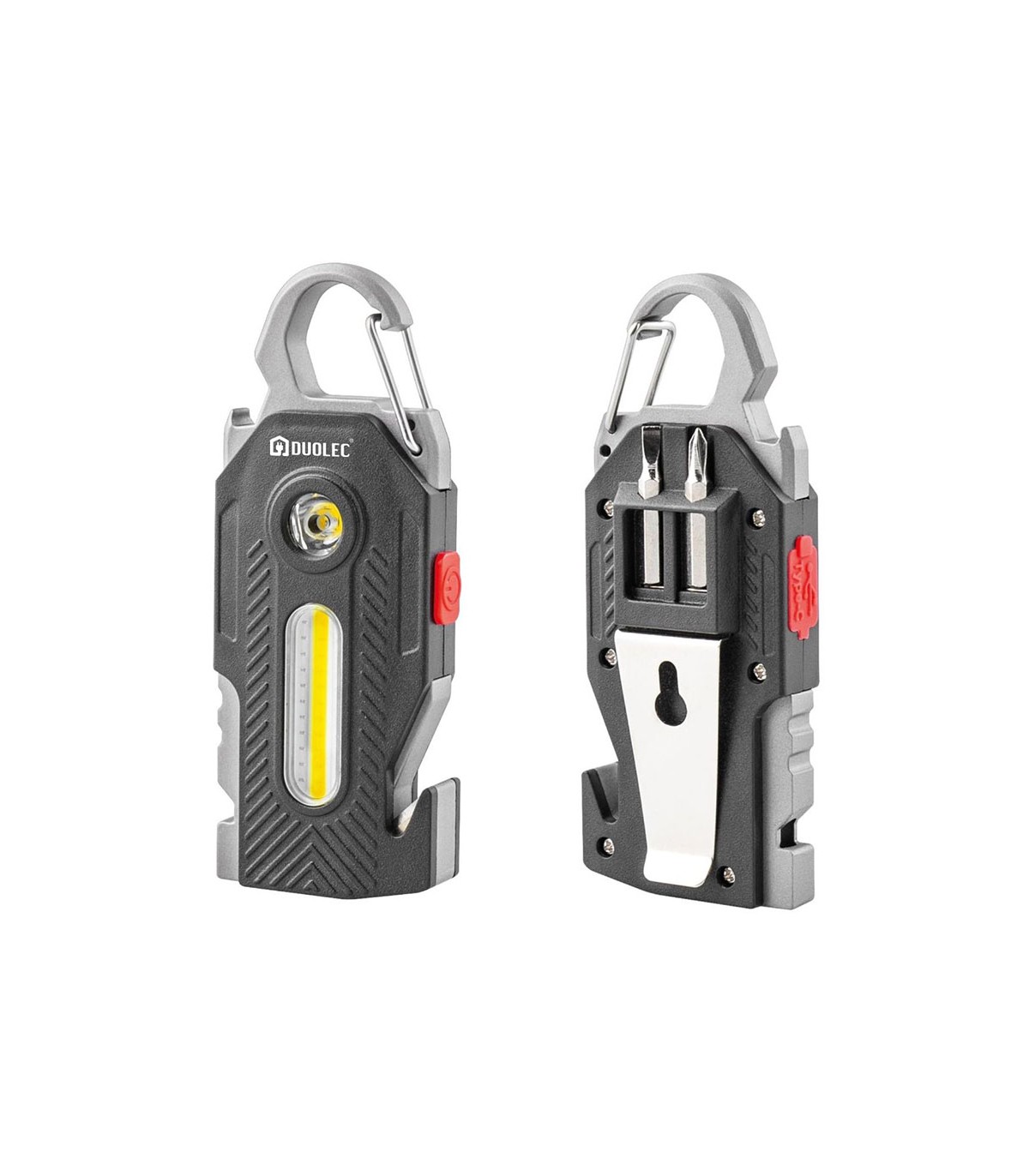 Cuerpo de aluminio y ABS. Multiusos. Funciona con batería de litio 1 x 3,7V 300 mAh. 2 puntos LED. 6 modos de funcionamiento: 400 lm - 200 lm - 120 lm - 50 lm - 35 lm - Señalización rojo-azul. Incluye cable USB C, abre botellas, cúter, silbido y destornillador. Protección IP44.