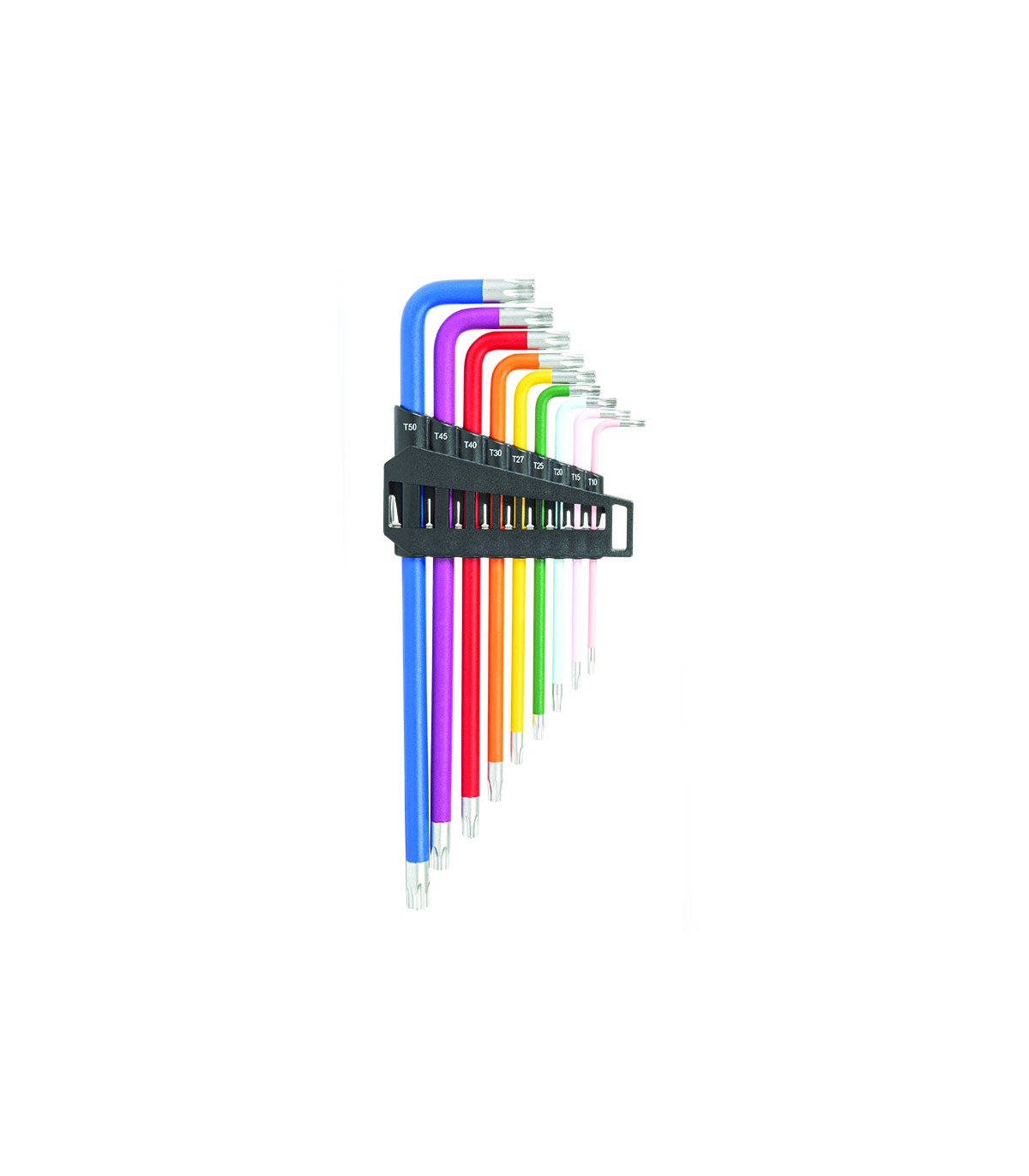 Torx seguridad XL. 9 piezas, formato extra largo. Acero cromo-vanadio con recubrimiento de pintura electrostática de color para facilitar la diferenciación de medidas. Soporte plástico..
