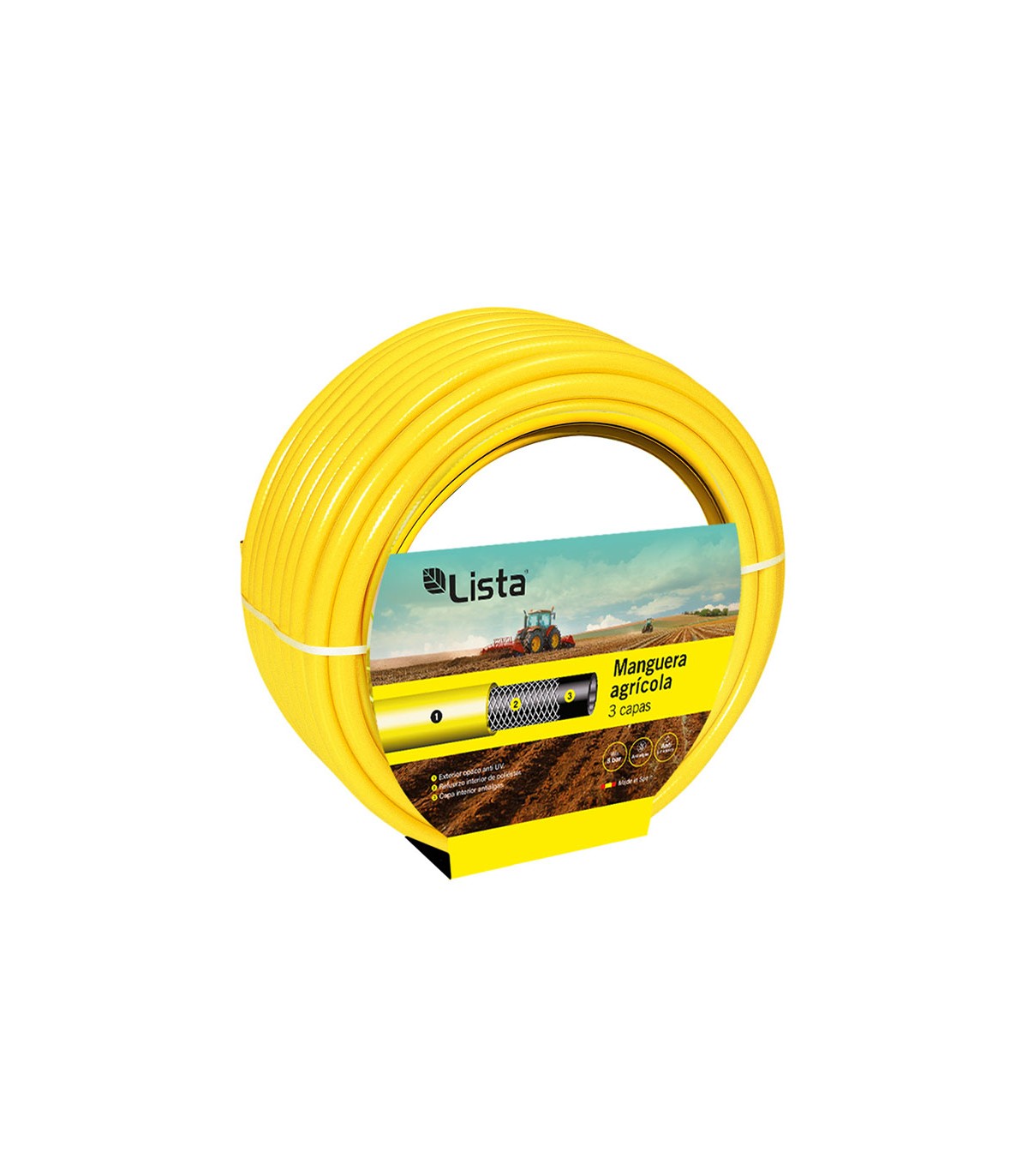 Agrícola, tricapa con trama interior de poliéster. Color amarillo exterior y negro interior. Presión servicio 8 bares.